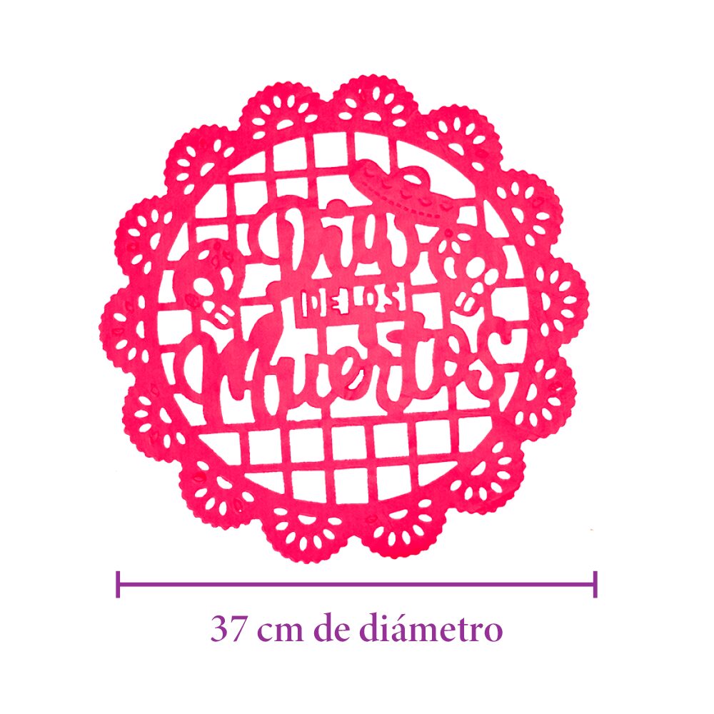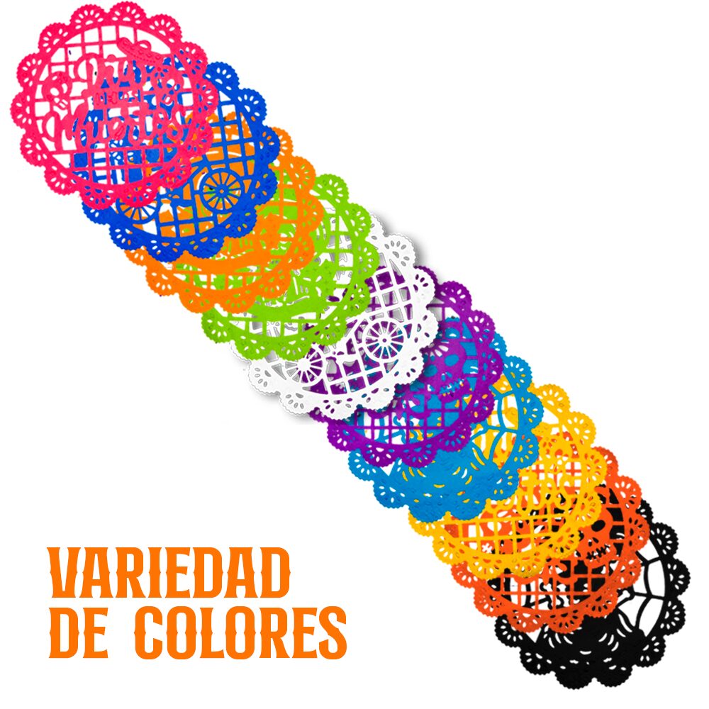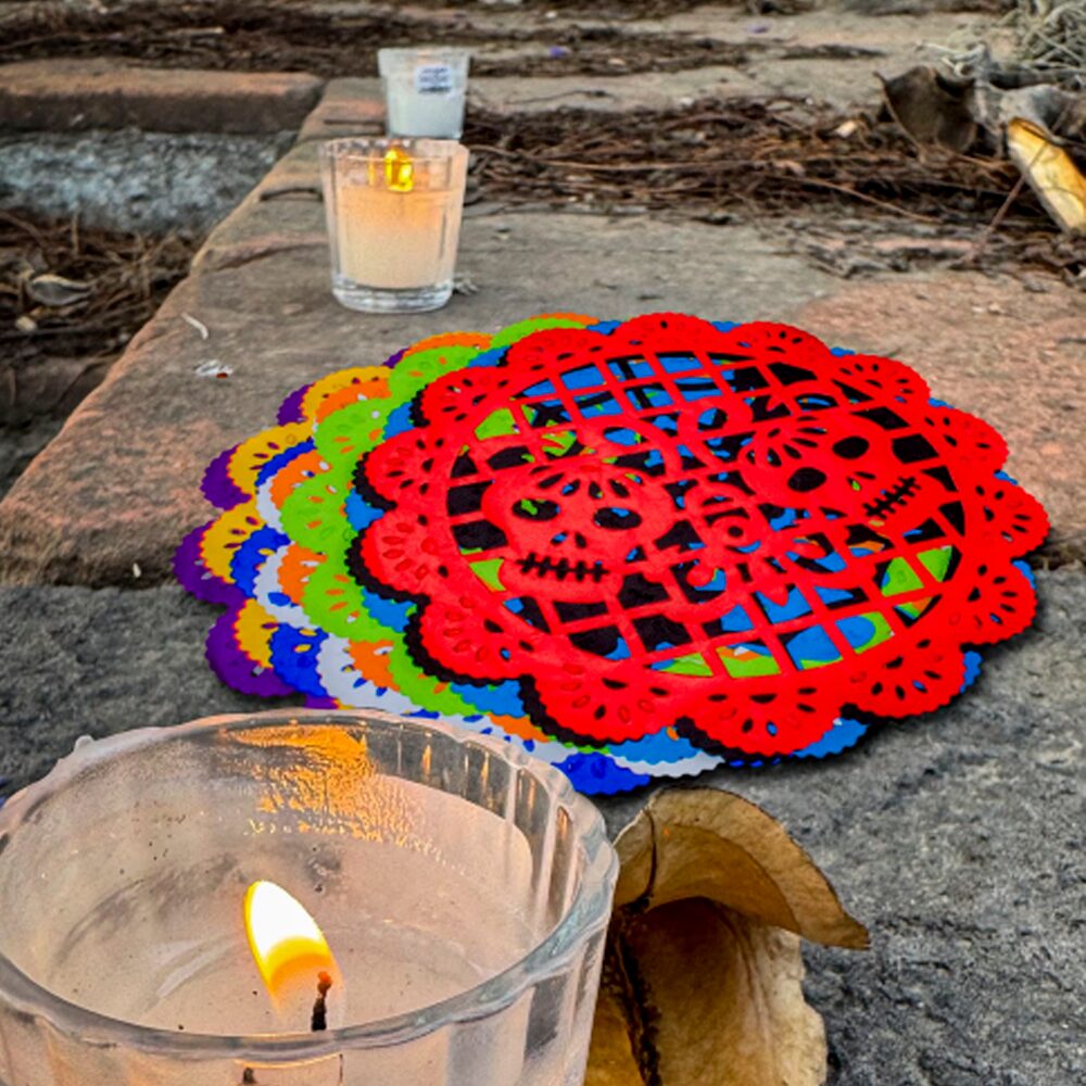 Cien carpetas redondas hechas de papel china, en una vibrante combinación de 10 colores. Perfectas para llenar de color, movimiento y simbolismo cualquier espacio durante el Día de Muertos, desde altares hasta muros y mesas festivas.