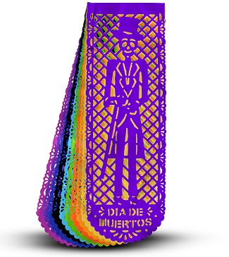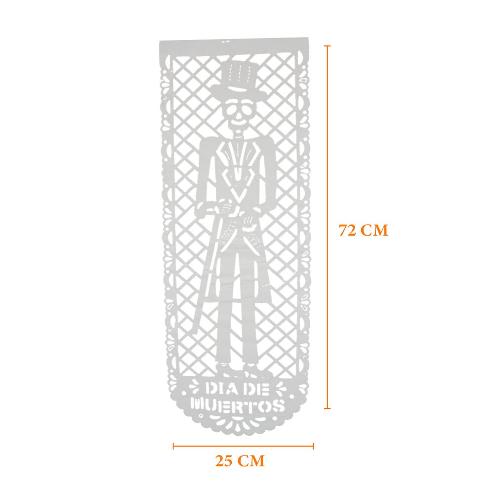 Paquete con 100 carpetas de papel picado elaboradas en papel china, con diseño vertical de catrín y la frase “Día de Muertos”. Cada carpeta mide 72 × 25 cm y viene en una combinación de 10 colores distintos. Ideal para decorar altares, muros o espacios festivos con un estilo tradicional, elegante y lleno de simbolismo.