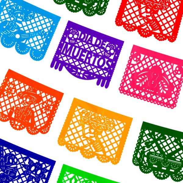 Llena de vida tu espacio con la tira decorativa de papel picado vertical tamaño 1/2, elaborada con diseños de catrín, catrina y calaveras. Su presentación incluye 3 diseños diferentes en combinación multicolor, perfectos para resaltar altares, paredes o eventos especiales durante el Día de Muertos. Una pieza artesanal que aporta un toque único y festivo a cualquier decoración.