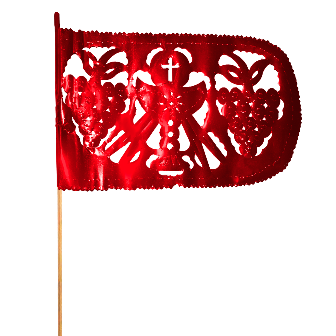 Banderita metálica roja de Semana Santa, calada a mano con detalles únicos y montada en palito tipo bandera. Perfecta para decorar altares, eventos y espacios especiales.