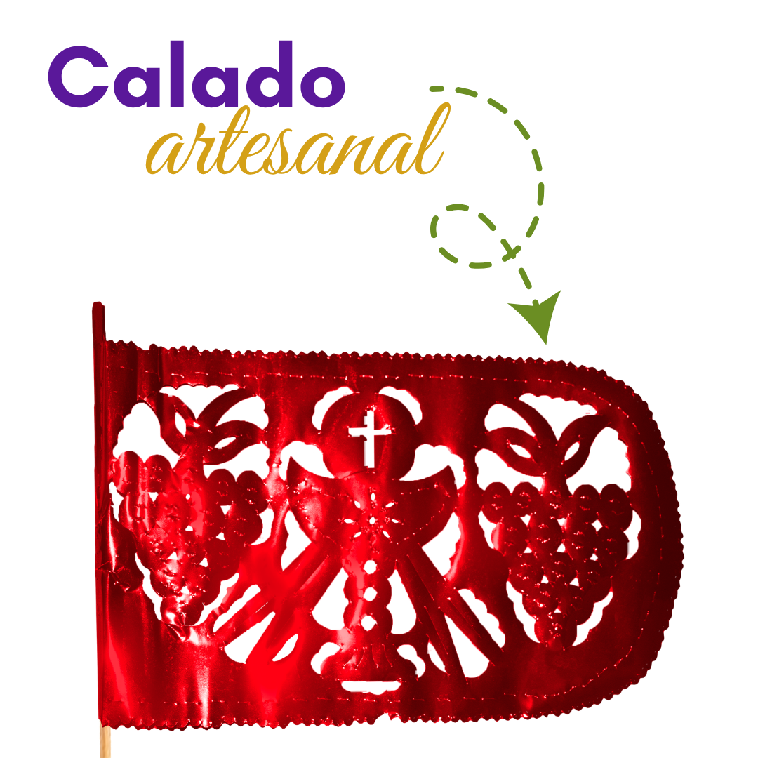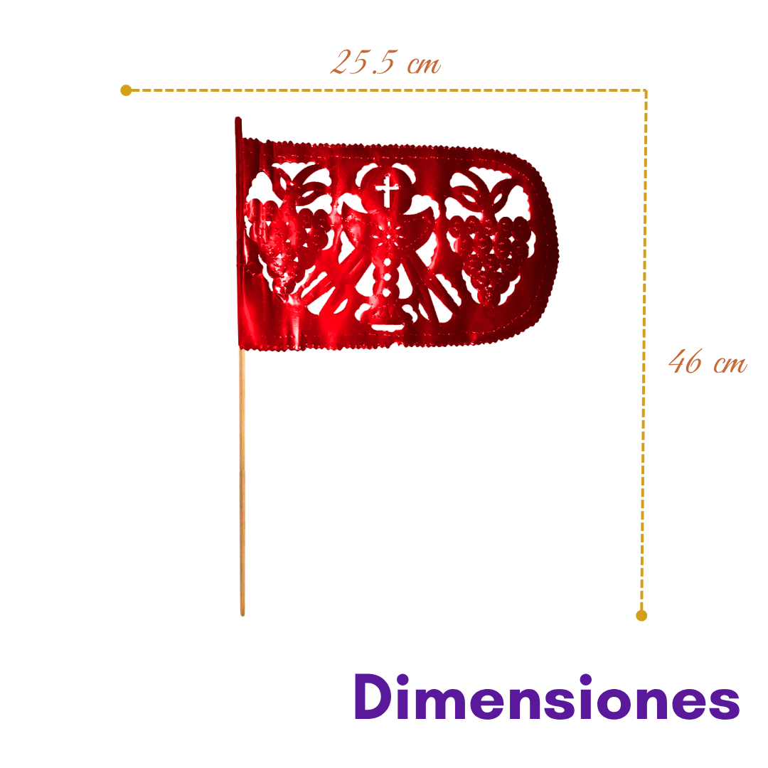 Nuestra banderita metálica decorativa de Semana Santa es una pieza artesanal que destaca por su diseño calado a mano y sus detalles finamente trabajados. Elaborada en papel metálico rojo de alta calidad, refleja la luz de forma sutil, creando un efecto visual elegante y llamativo en cualquier espacio.