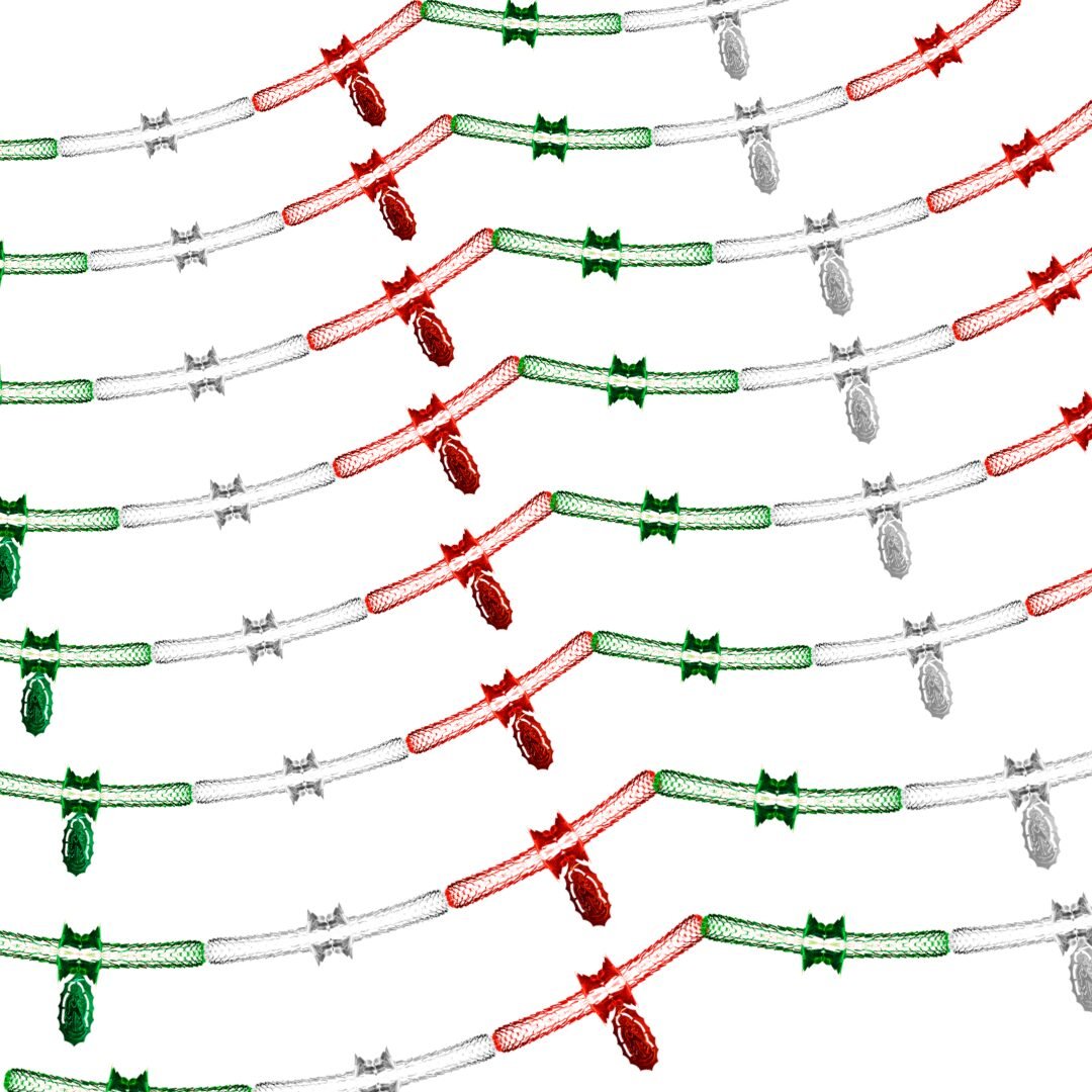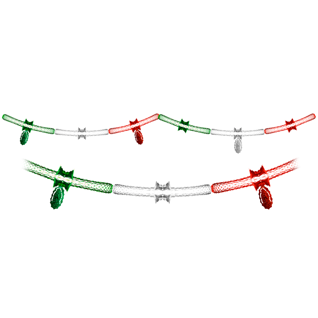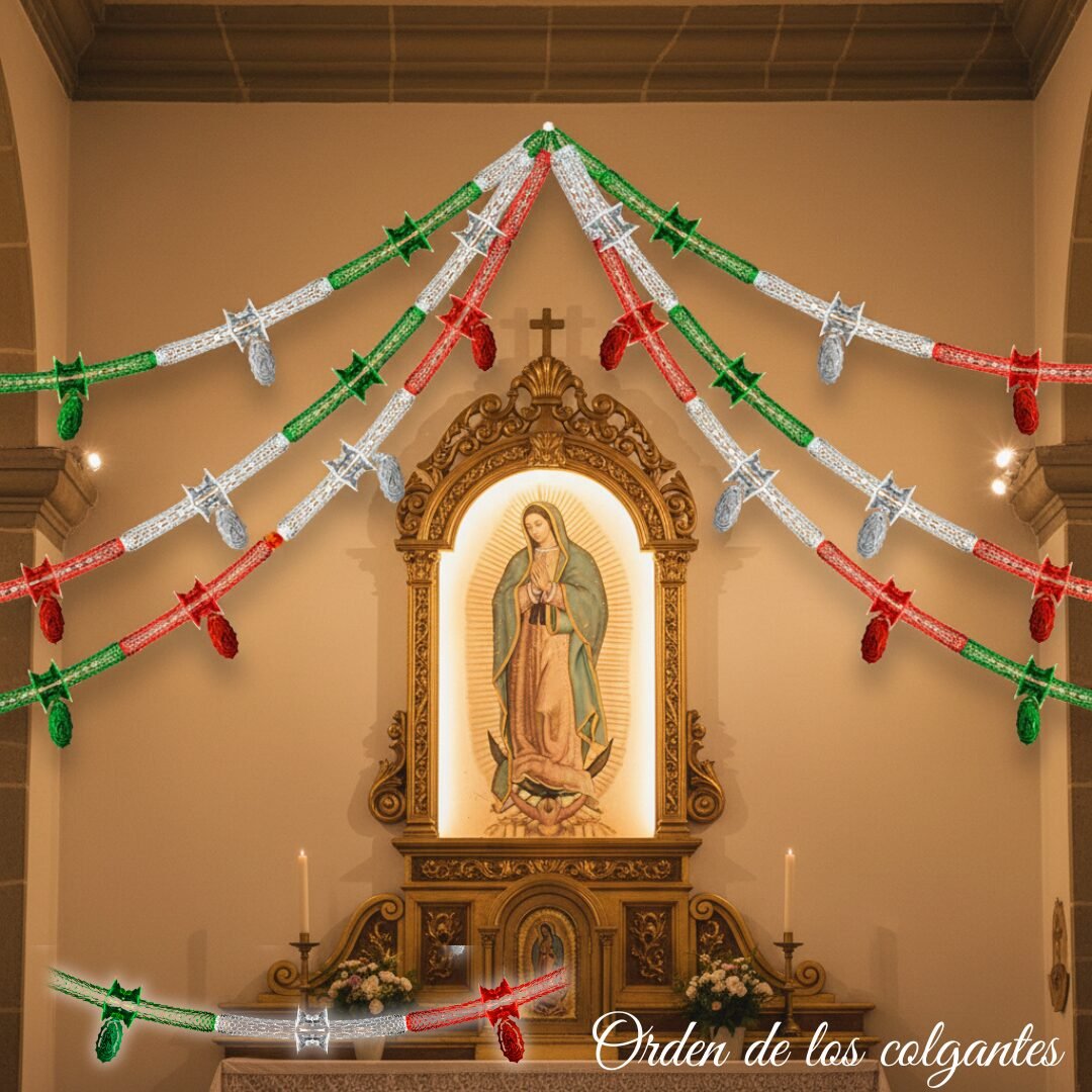 Cadena de barril metálica en combinación tricolor, con colgantes intercalados de la Virgen de Guadalupe. Es montable, grande y muy brillante, ideal para decorar exteriores.