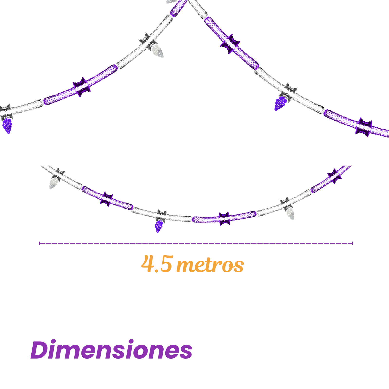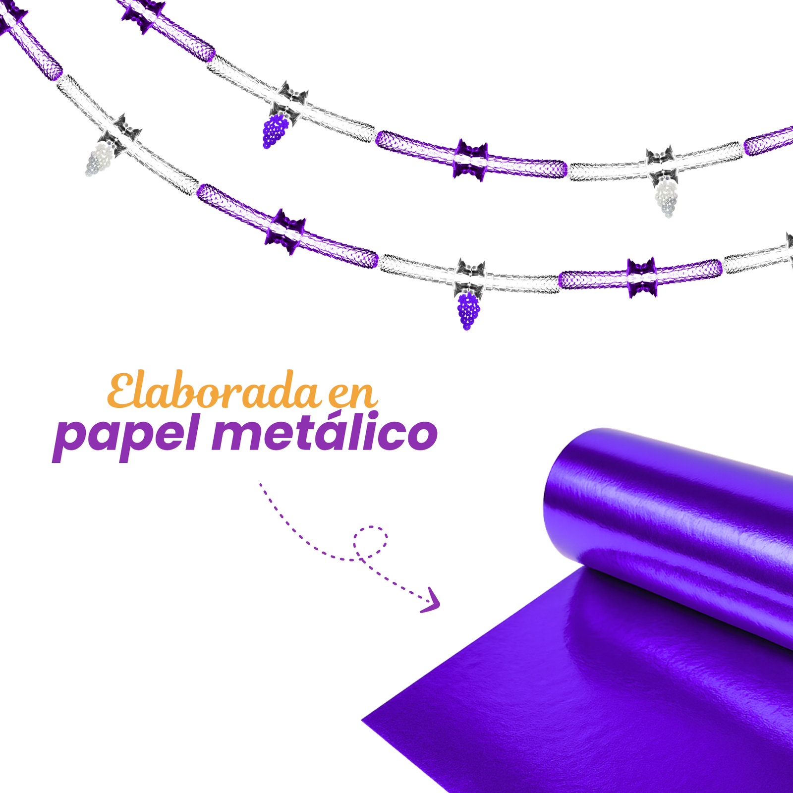 Elaborada en papel metálico, presenta una estructura decorativa en tonos plata y morado que genera contraste visual y brillo dentro del montaje. Su diseño permite crear líneas decorativas continuas en techos, pasillos o fondos, aportando presencia sin saturar el espacio. Gracias a su estructura ligera, es fácil de instalar y combinar con otros elementos decorativos de temporada. Se recomienda su uso en interiores. Incluye elementos colgantes decorativos que añaden mayor detalle y volumen visual.