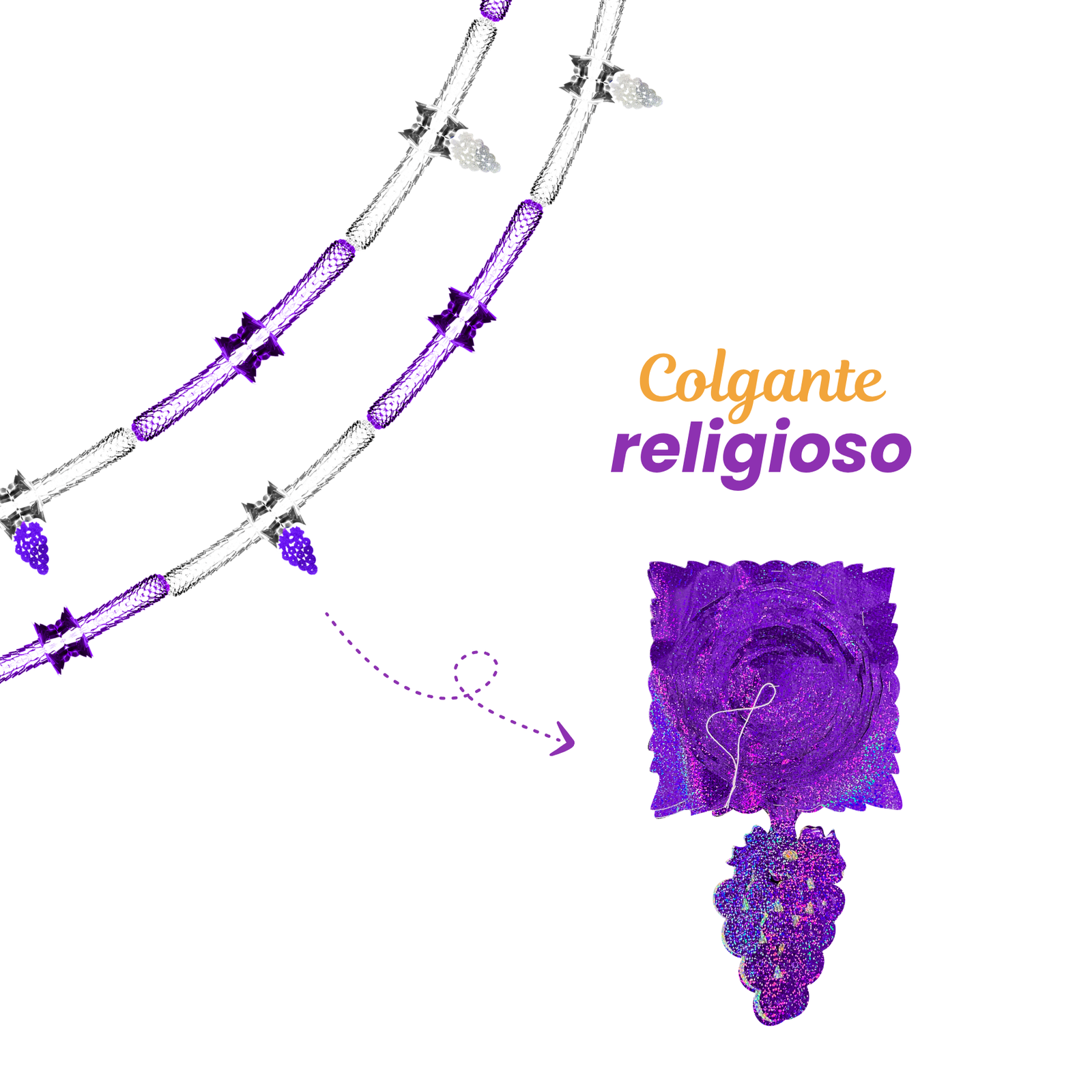 La Cadena Metálica Plata–Morado es una tira decorativa diseñada para ambientaciones de Semana Santa, ideal para complementar altares, muros y espacios ceremoniales con una combinación tradicional de color. Incluye elementos colgantes decorativos que añaden mayor detalle y volumen visual.