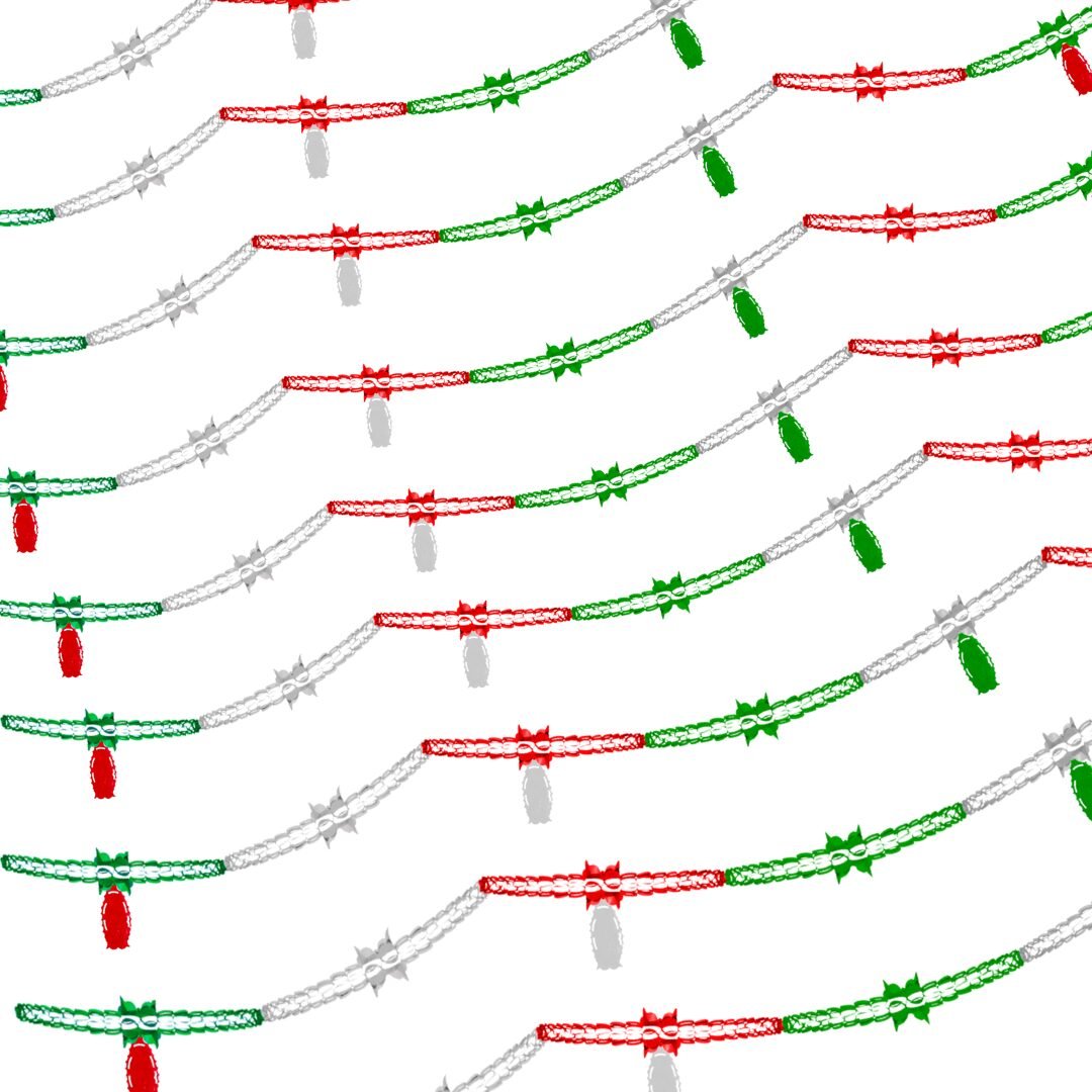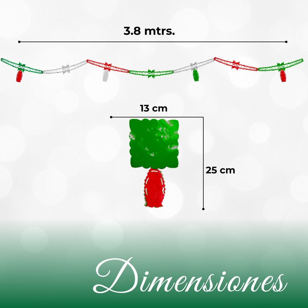 Cadena decorativa guadalupana hecha de plástico, delgada y ligera, con colgantes tricolor de la Virgen de Guadalupe. El paquete incluye 10 cadenas listas para colocar.