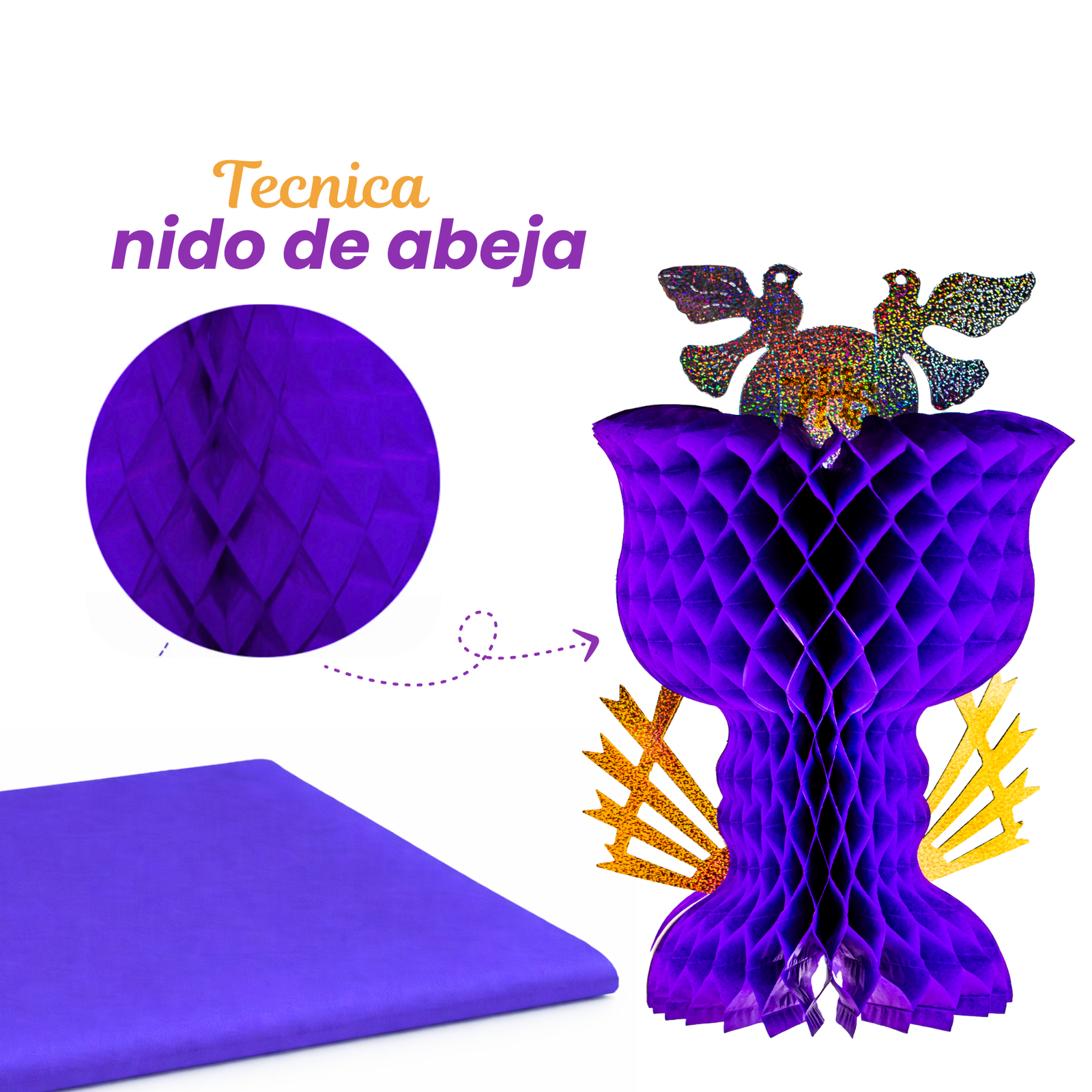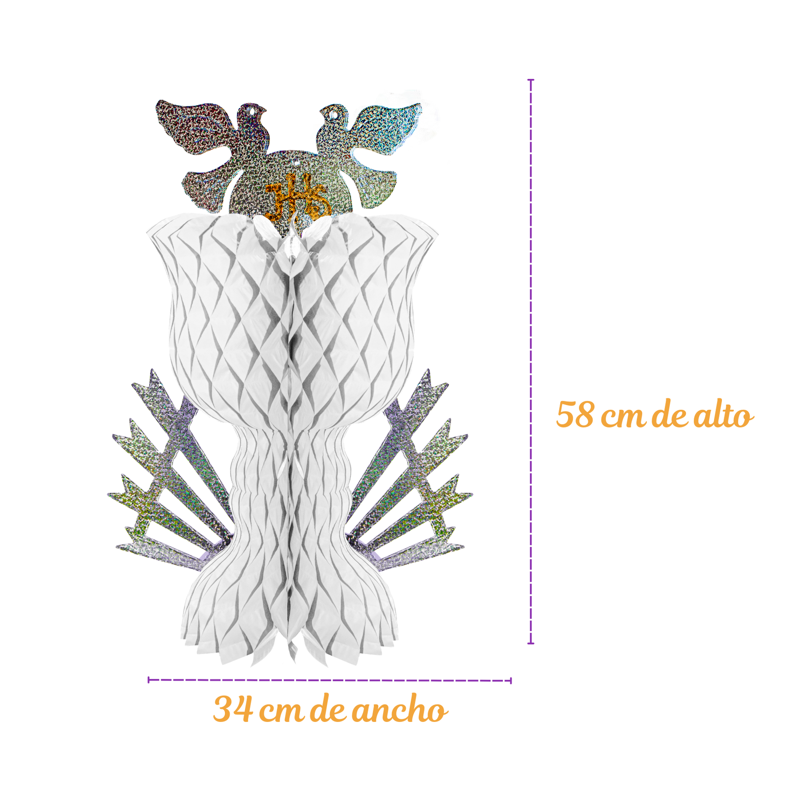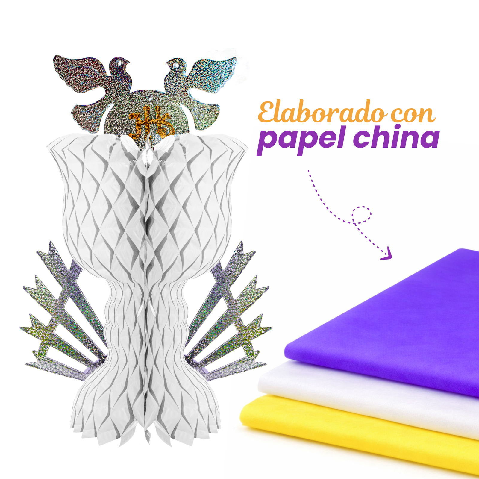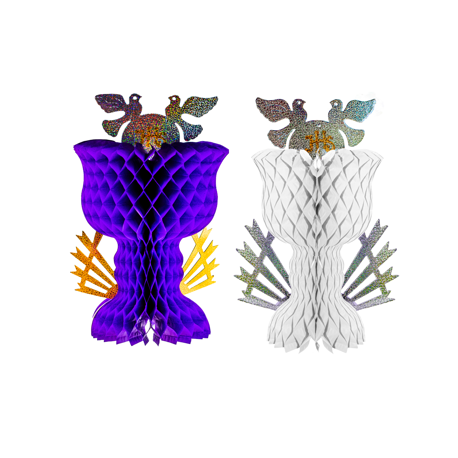 Cáliz decorativo plegable de papel china, con detalles en cartulina brillante. Disponible en morado y blanco. Ordénalo ahora y completa tu decoración de temporada.