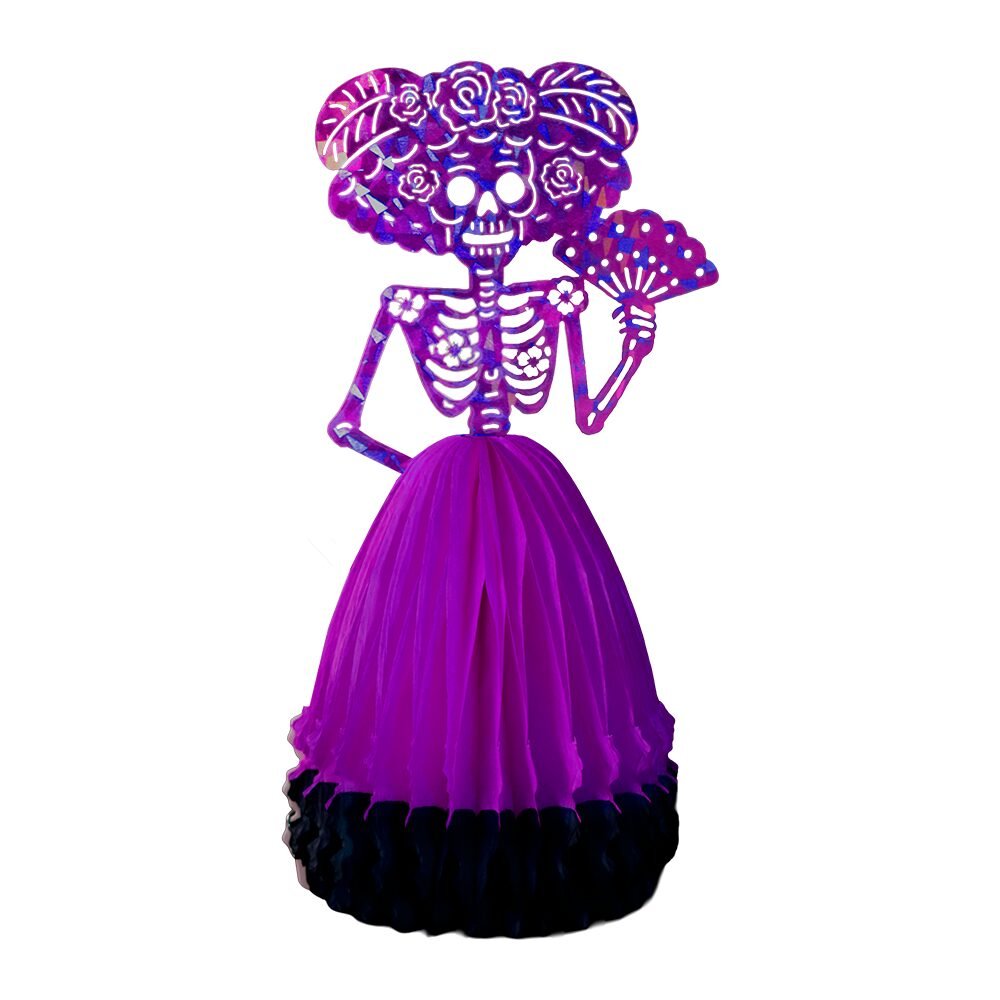 Catrina decorativa con abanico, acompañada de una falda elaborada en papel china con técnica nido de abeja. Su diseño artesanal y lleno de color es ideal para decorar altares, mesas o espacios festivos con un estilo elegante, tradicional y muy mexicano.