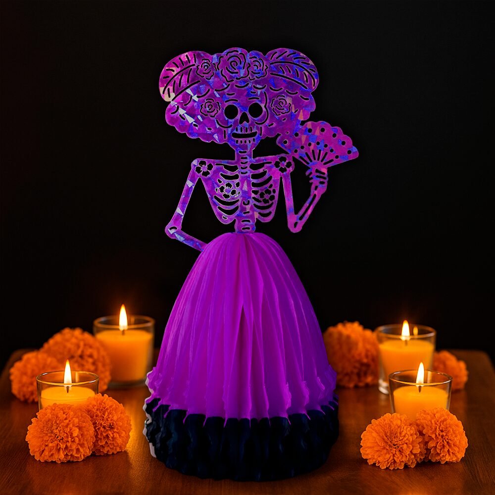 Añade un toque elegante y colorido a tu altar con nuestra catrina con abanico y falda de papel china. ¡Descúbrela y celebra con estilo!