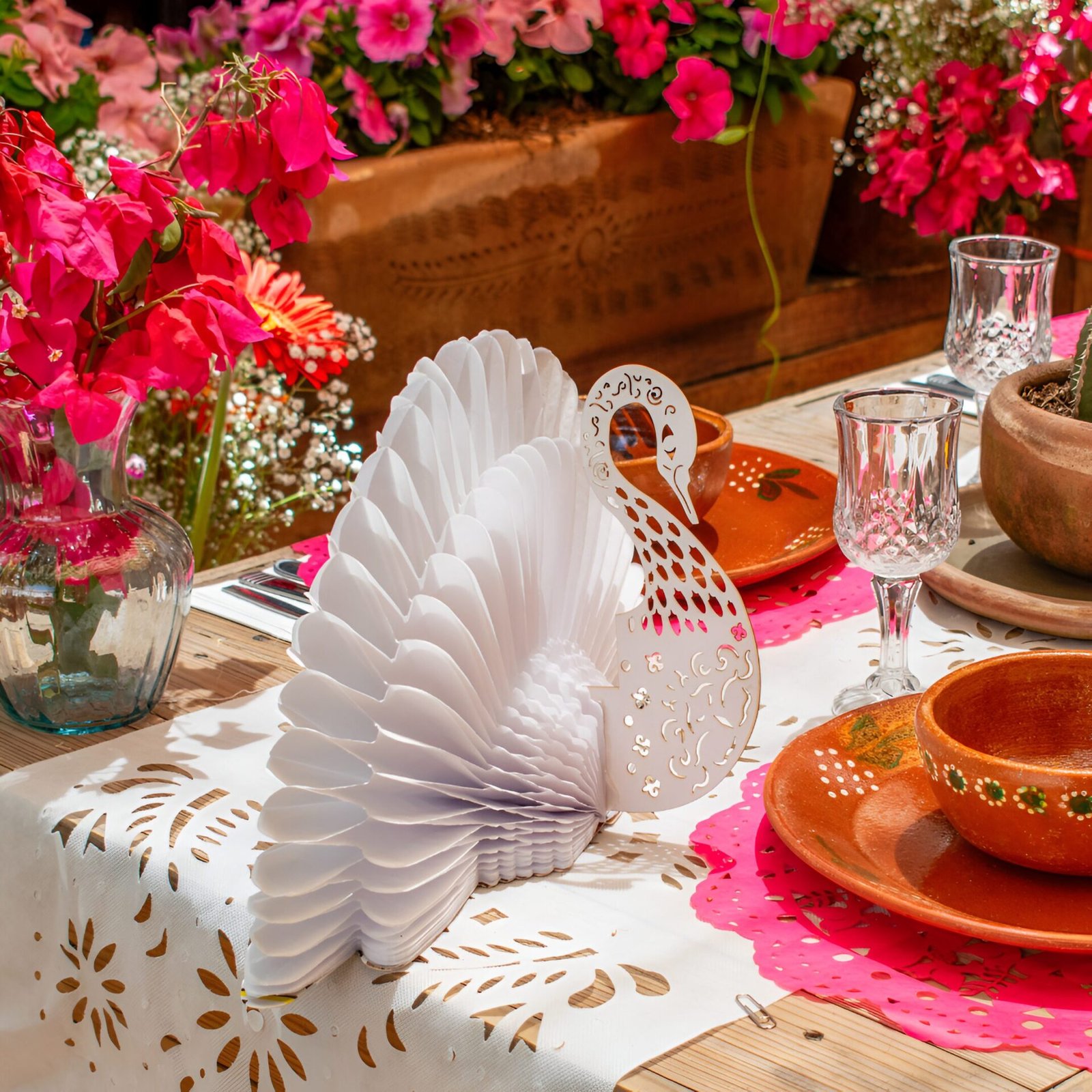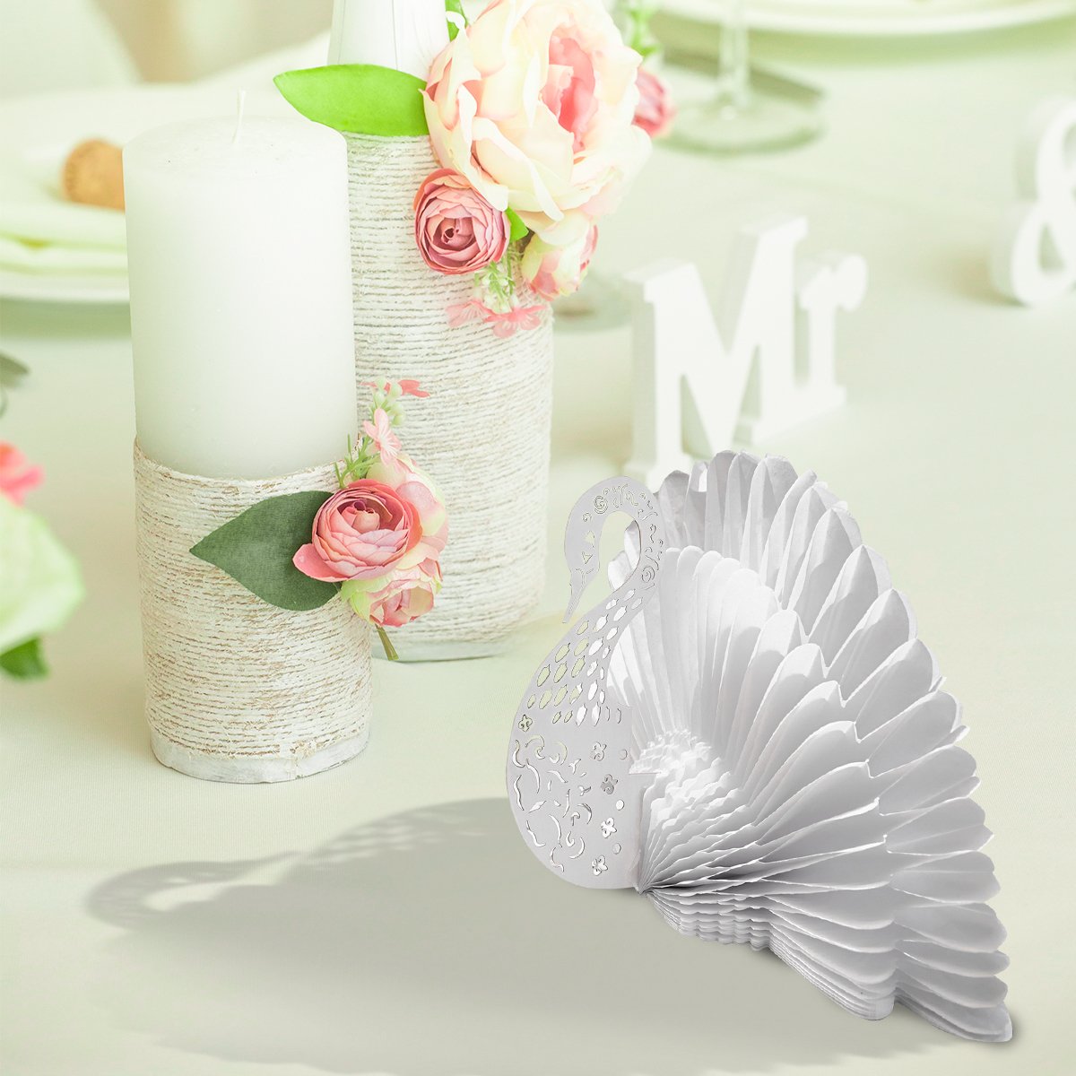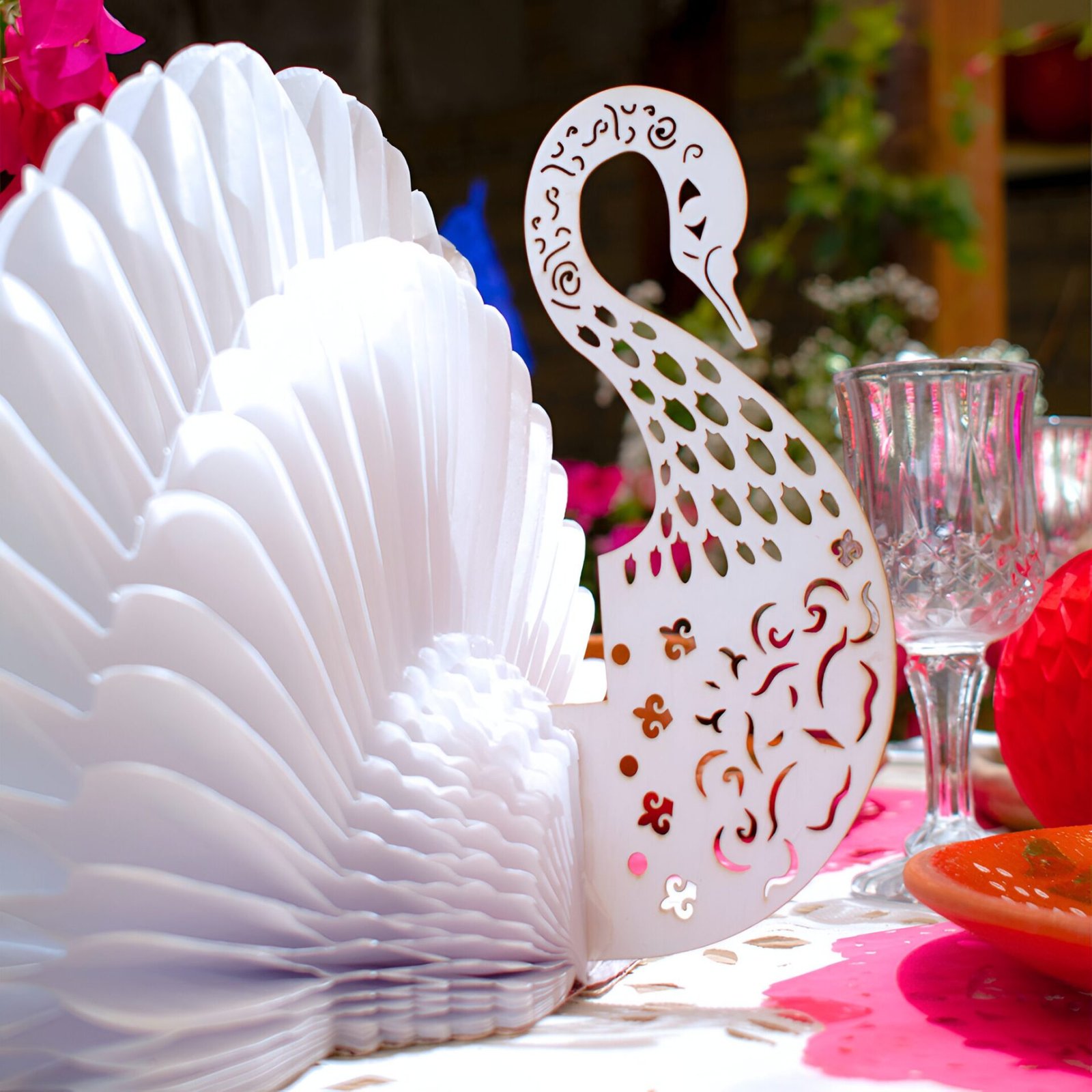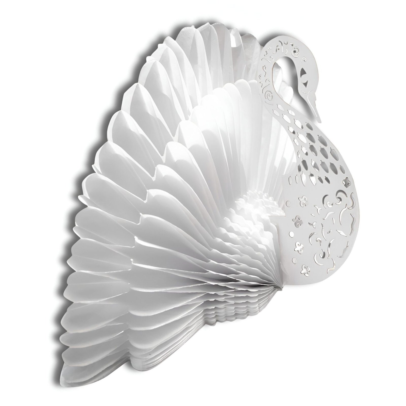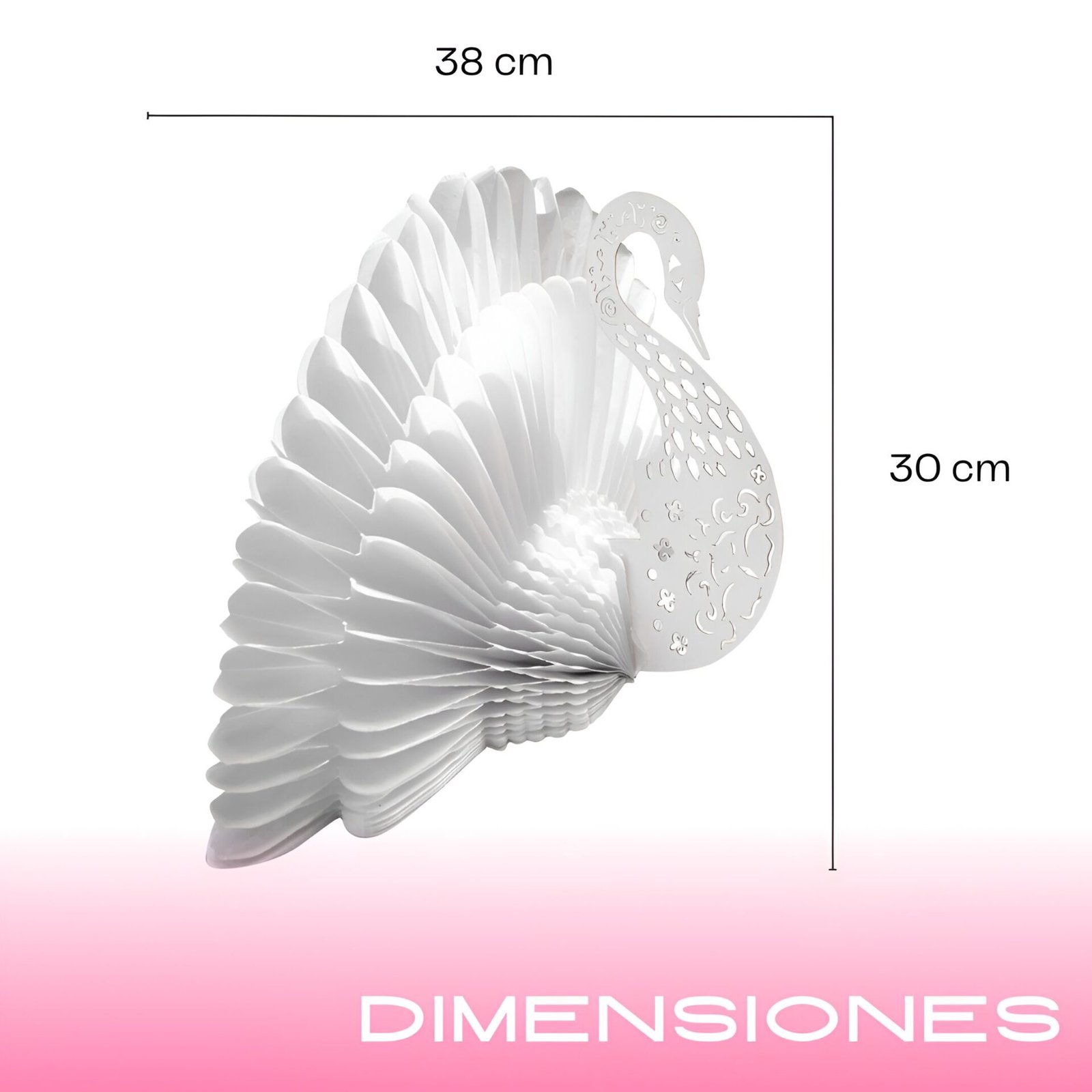 Elegante figura decorativa en forma de cisne, elaborada con papel china blanco utilizando la técnica de nido de abeja, que le da un volumen espectacular y delicado. El cuerpo está complementado con detalles finamente recortados en cartulina gruesa, formando un diseño armonioso y sofisticado. Su estructura plegable permite guardarlo fácilmente y reutilizarlo en múltiples ocasiones.