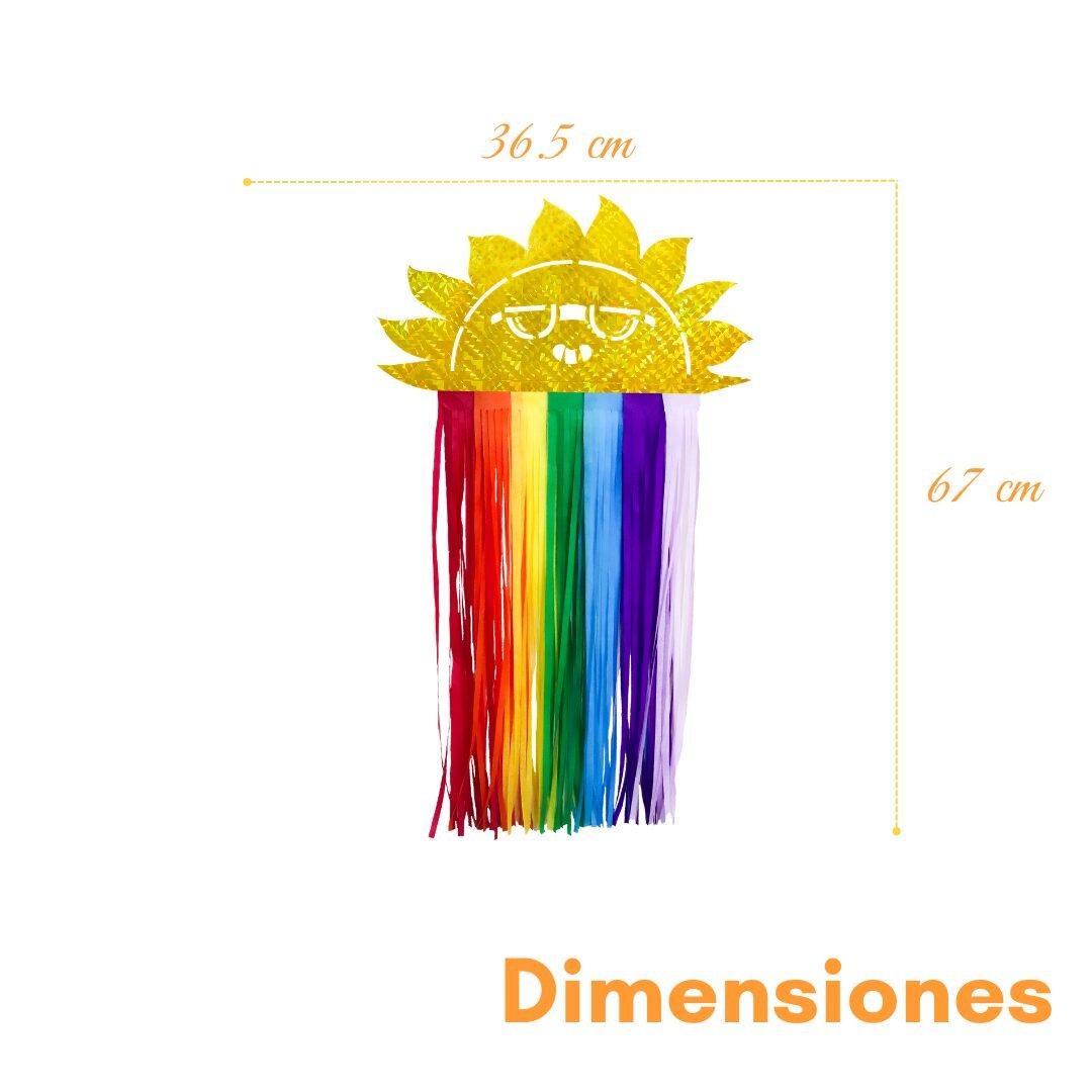 En la parte inferior cuelga la cortina multicolor estilo arcoíris, creando movimiento y un efecto visual divertido que realza cualquier espacio. Su tamaño pequeño la hace ideal para decorar mesas, fondos fotográficos, paredes, candy bar o rincones especiales en fiestas y eventos.