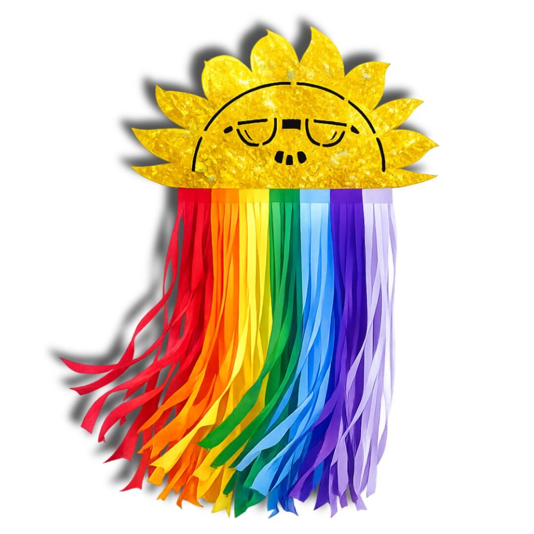 Cortina sol arcoíris decorativa perfecta para ambientaciones alegres y temáticas. Este diseño combina una parte superior en forma de sol con rostro, elaborada en cartulina holográfica dorada que refleja la luz y aporta un acabado llamativo.