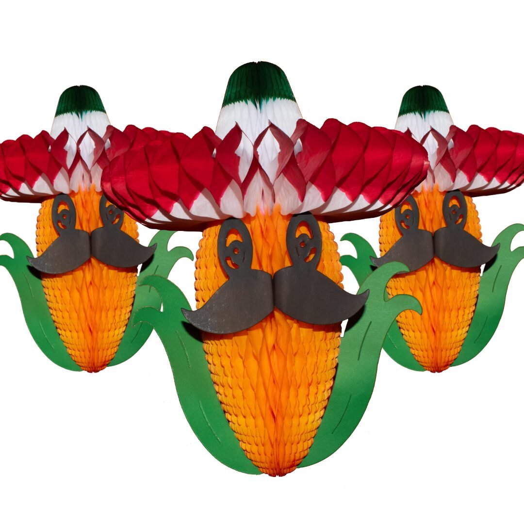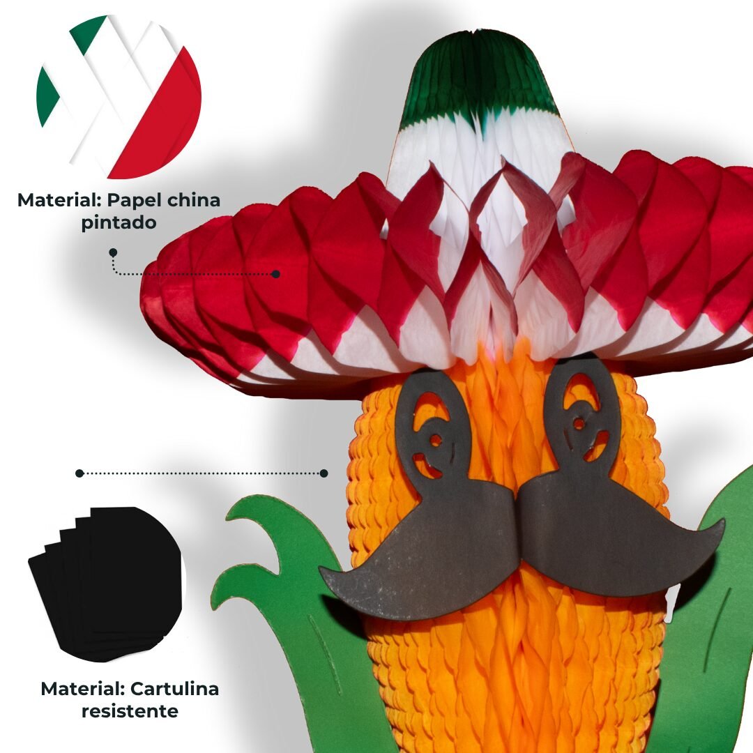 Elote artesanal decorativo, elaborado con papel china utilizando la técnica nido de abeja que le da volumen y forma. Es un producto plegable, fácil de armar y guardar, con detalles en cartulina que lo caracterizan y le dan un toque divertido y original. Perfecto para decorar mesas, vitrinas o ambientar eventos con temática mexicana de forma creativa y colorida.