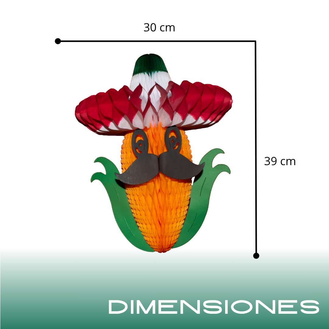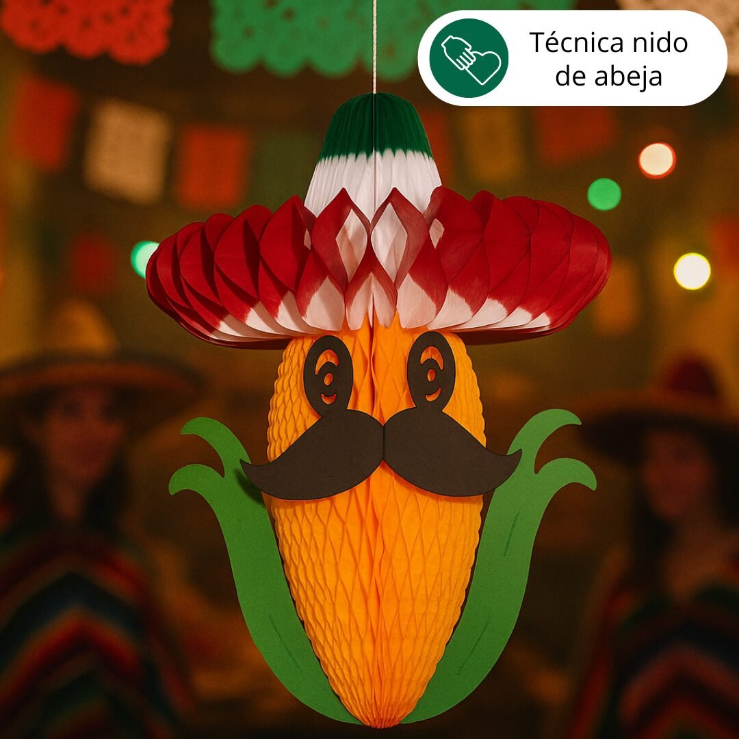 Elote artesanal decorativo, elaborado con papel china utilizando la técnica nido de abeja que le da volumen y forma. Es un producto plegable, fácil de armar y guardar, con detalles en cartulina que lo caracterizan y le dan un toque divertido y original. Perfecto para decorar mesas, vitrinas o ambientar eventos con temática mexicana de forma creativa y colorida.