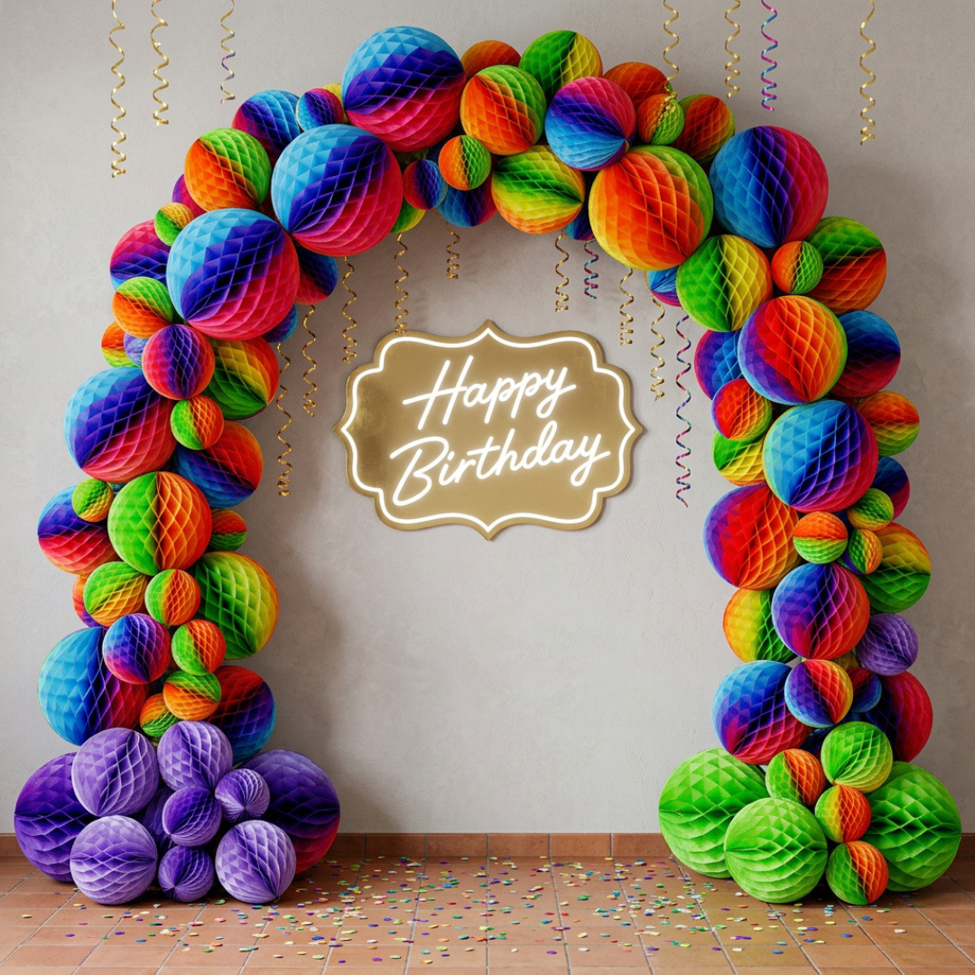 La esfera papel china tamaño 4 es una decoración multicolor elaborada con la técnica nido de abeja, la cual crea un efecto voluminoso y muy llamativo para ambientar distintos espacios. Está fabricada con papel china ligero y diseñada para ser plegable, lo que facilita su armado y permite guardarla fácilmente cuando no está en uso.