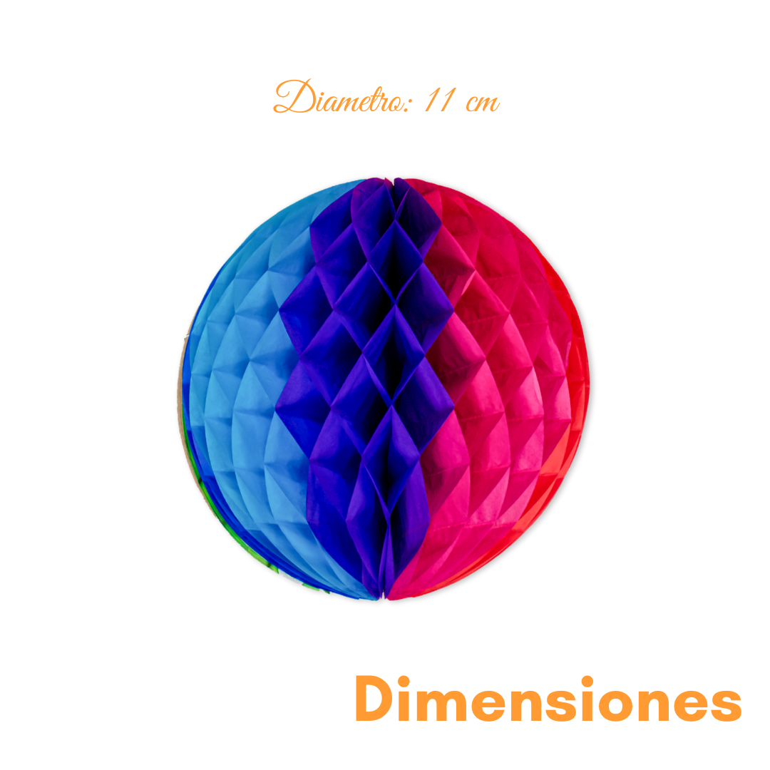 Esfera de papel china multicolor tamaño #1 hecha con técnica nido de abeja. Decoración plegable, ligera y fácil de armar que puede usarse colgada o medio abierta.