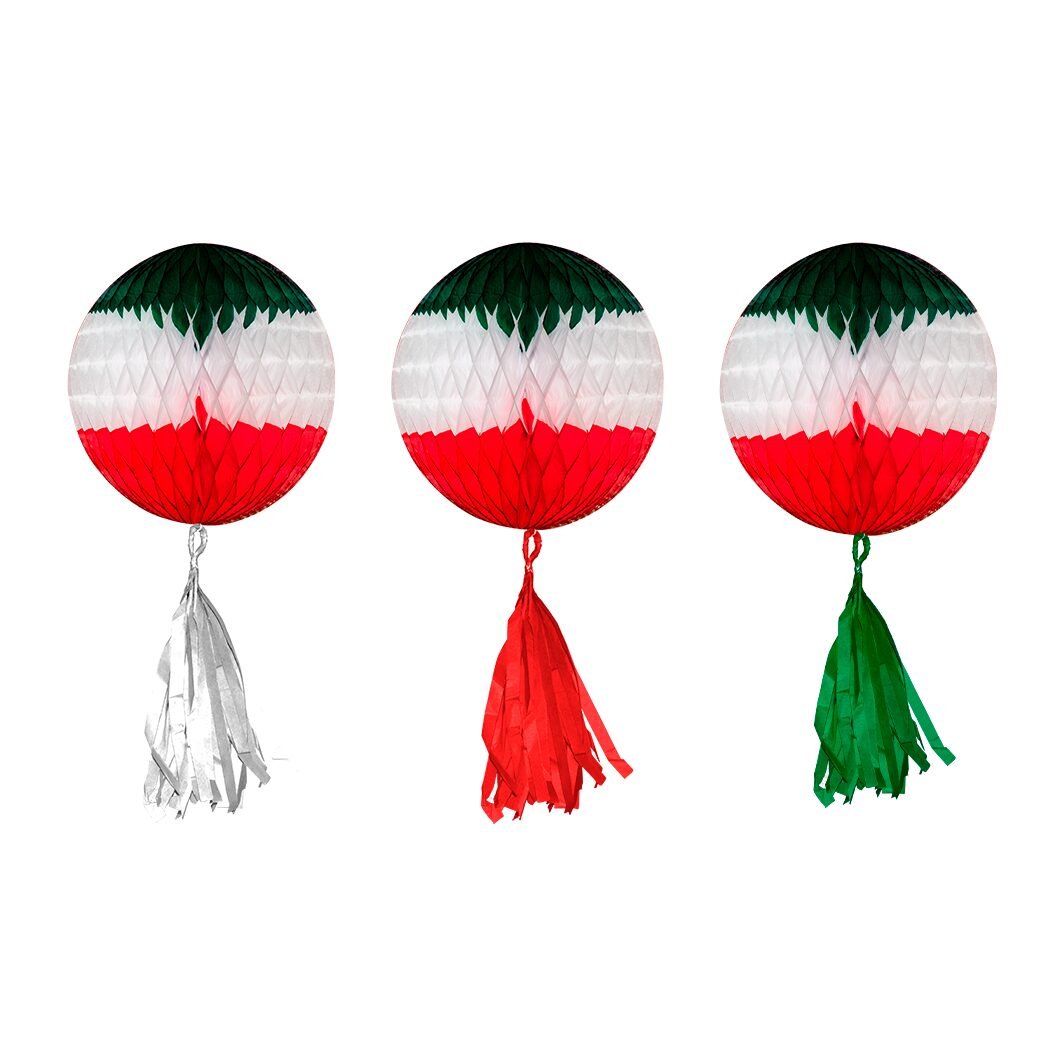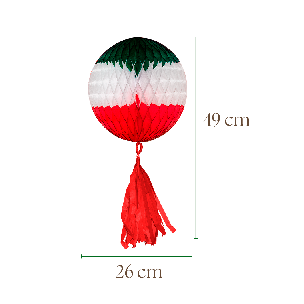 Este kit incluye 10 esferas colgantes, elaboradas en papel china con técnica nido de abeja y acompañadas de pompones colgantes. La combinación en verde, blanco y rojo da un aire festivo perfecto para decorar estanterías, mesas, marcos de puertas con un toque patrio y artesanal.