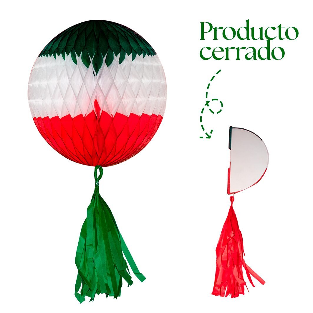 Decora con color y volumen tus celebraciones patrias con este kit de 10 esferas colgantes, elaboradas en papel china con la técnica nido de abeja para un efecto tridimensional. Cada esfera incluye un pompón colgante, también de papel, en una alegre combinación de verde, blanco y rojo. Ligeras, fáciles de colgar y perfectas para dar un toque festivo a techos, entradas o salones durante el mes patrio.