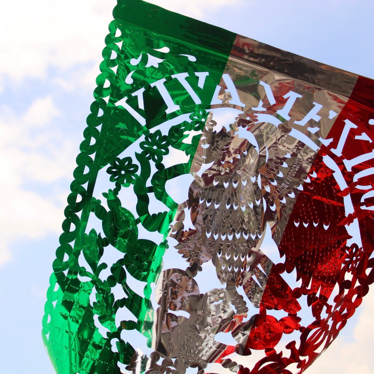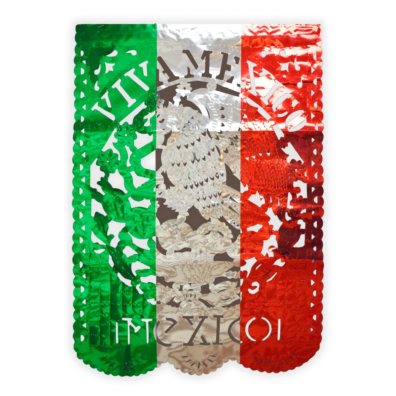 Estandarte tricolor artesanal en papel metálico con la leyenda “Viva México” y escudo nacional al centro. ¡Brillante y lleno de orgullo patrio!
