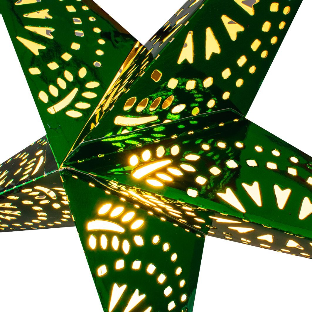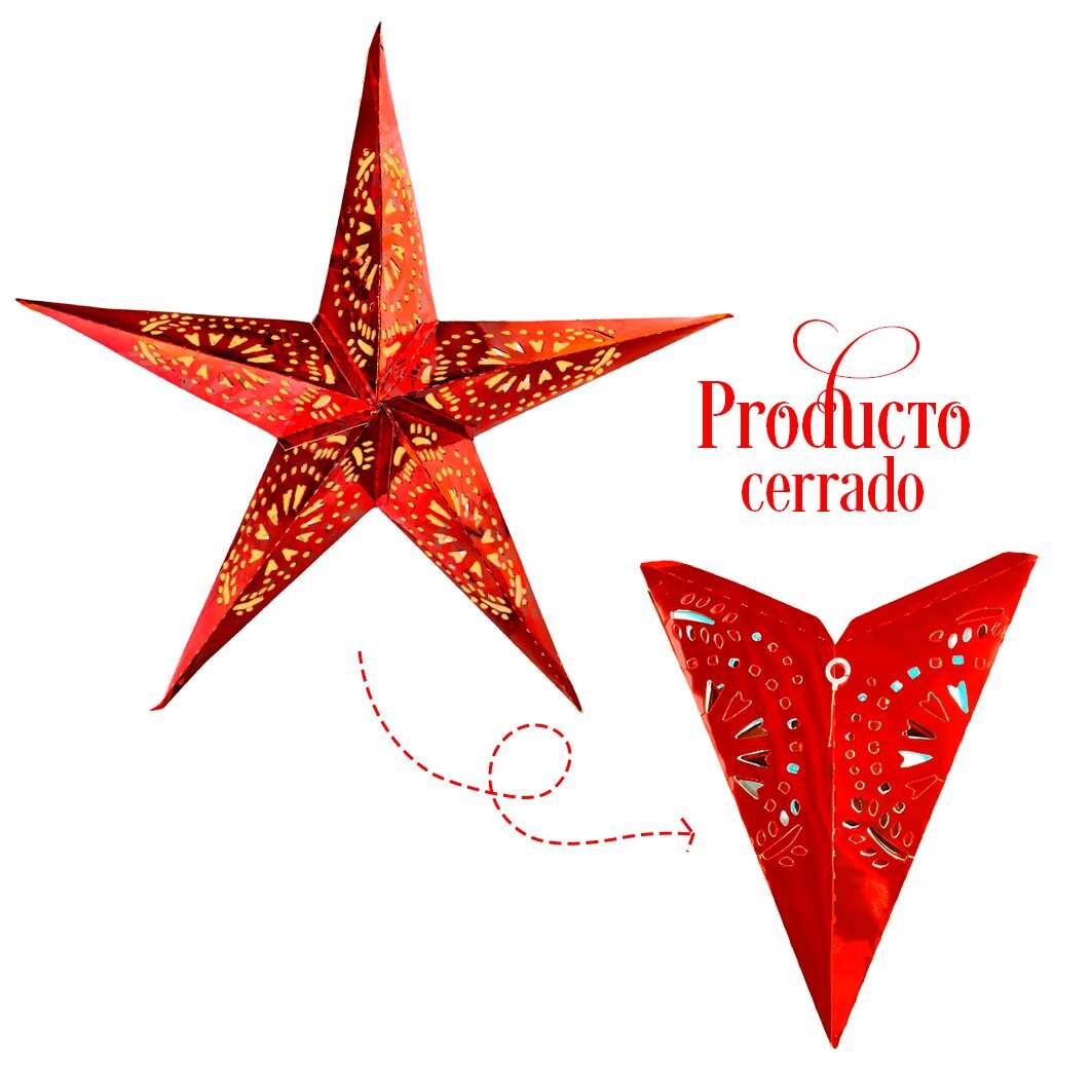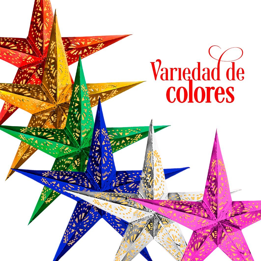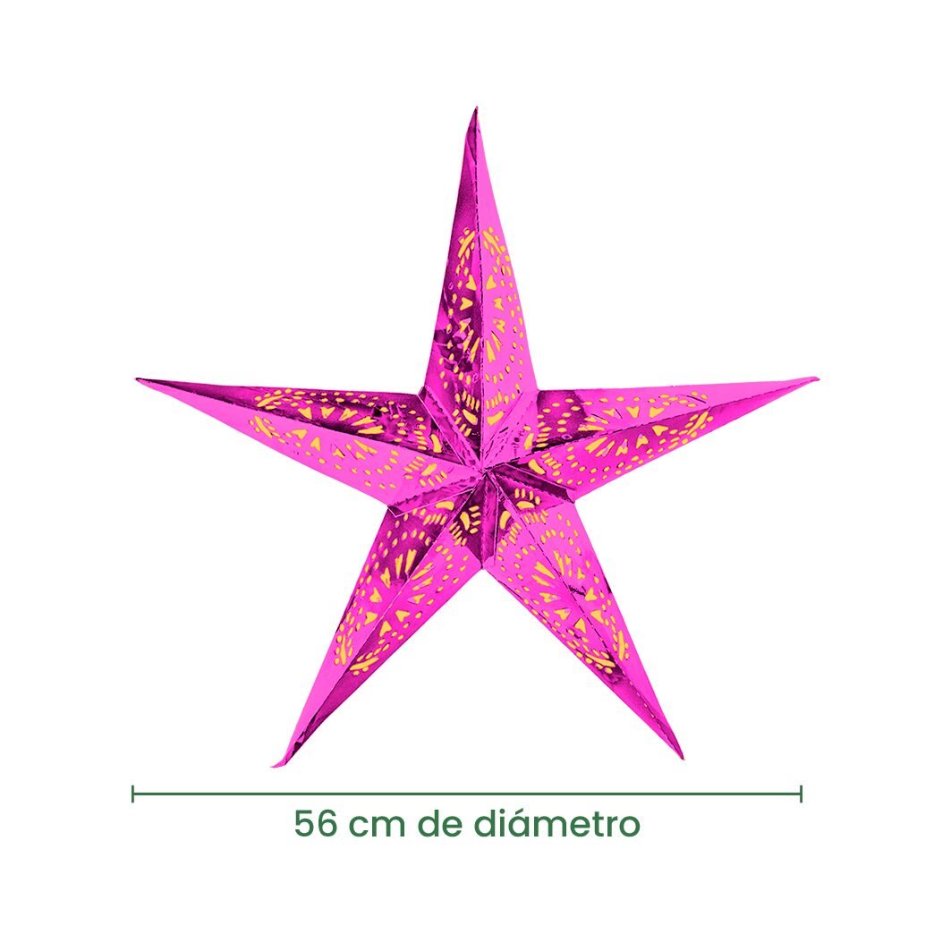 Estrellas decorativas elaboradas en cartulina metálica, cuentan con delicados cortes que permiten el paso de la luz, creando un efecto luminoso que transforma cualquier espacio. Su acabado brillante hacen que destaque en celebraciones navideñas, eventos especiales o decoraciones temáticas. Disponible en seis colores vibrantes, es una pieza ligera, fácil de montar y perfecta para colgar. Se vende de forma individual.