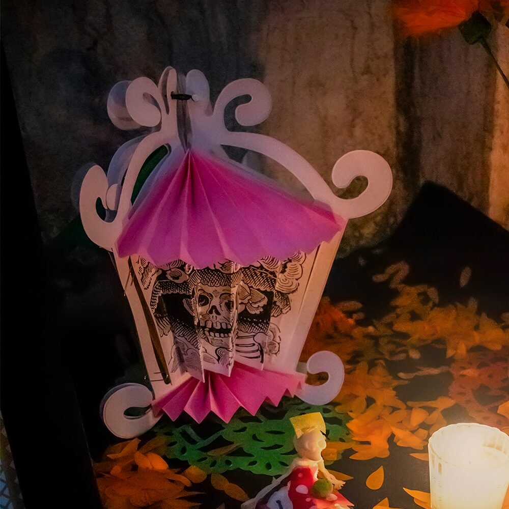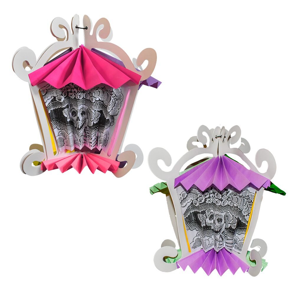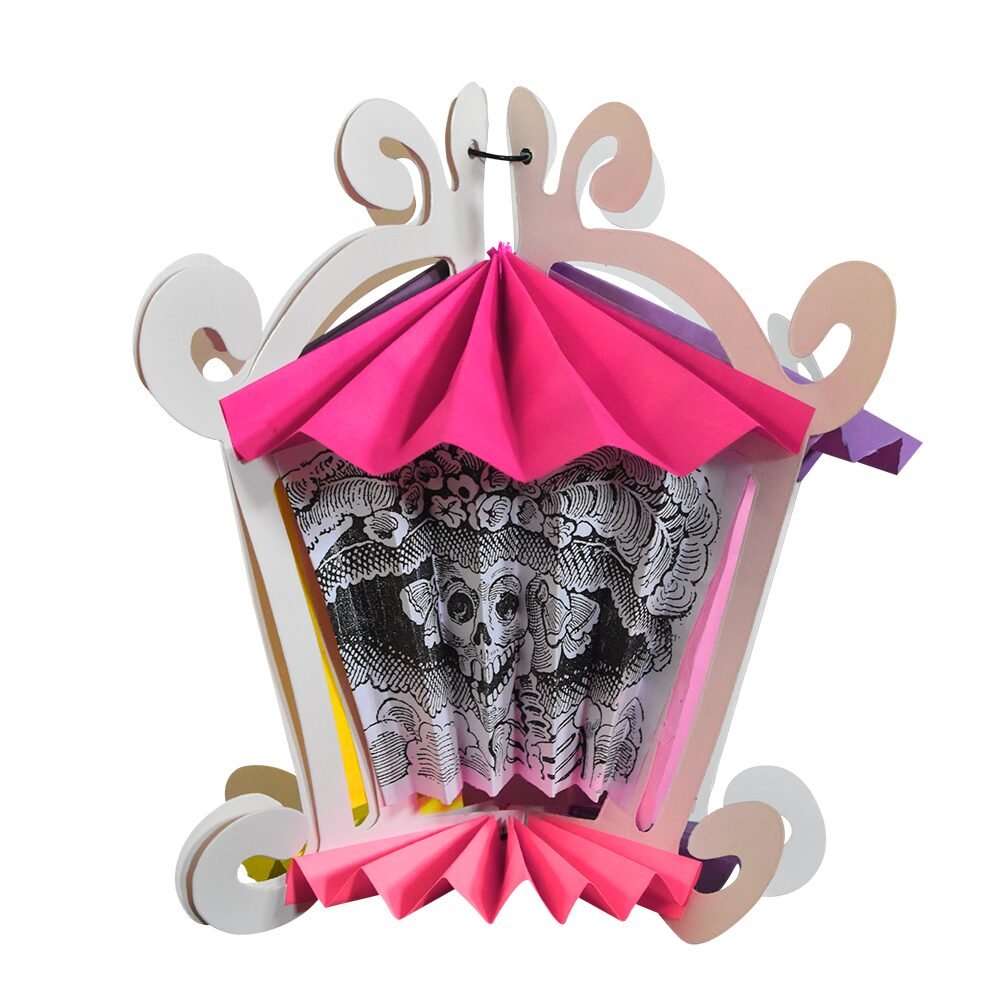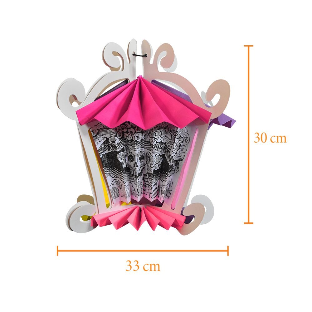 Farol artesanal plegable elaborado en cartulina, disponible en combinaciones multicolor. Su diseño tradicional es perfecto para añadir un toque cálido, colorido y festivo a tu altar de Día de Muertos, evocando la luz y la memoria de quienes ya no están.