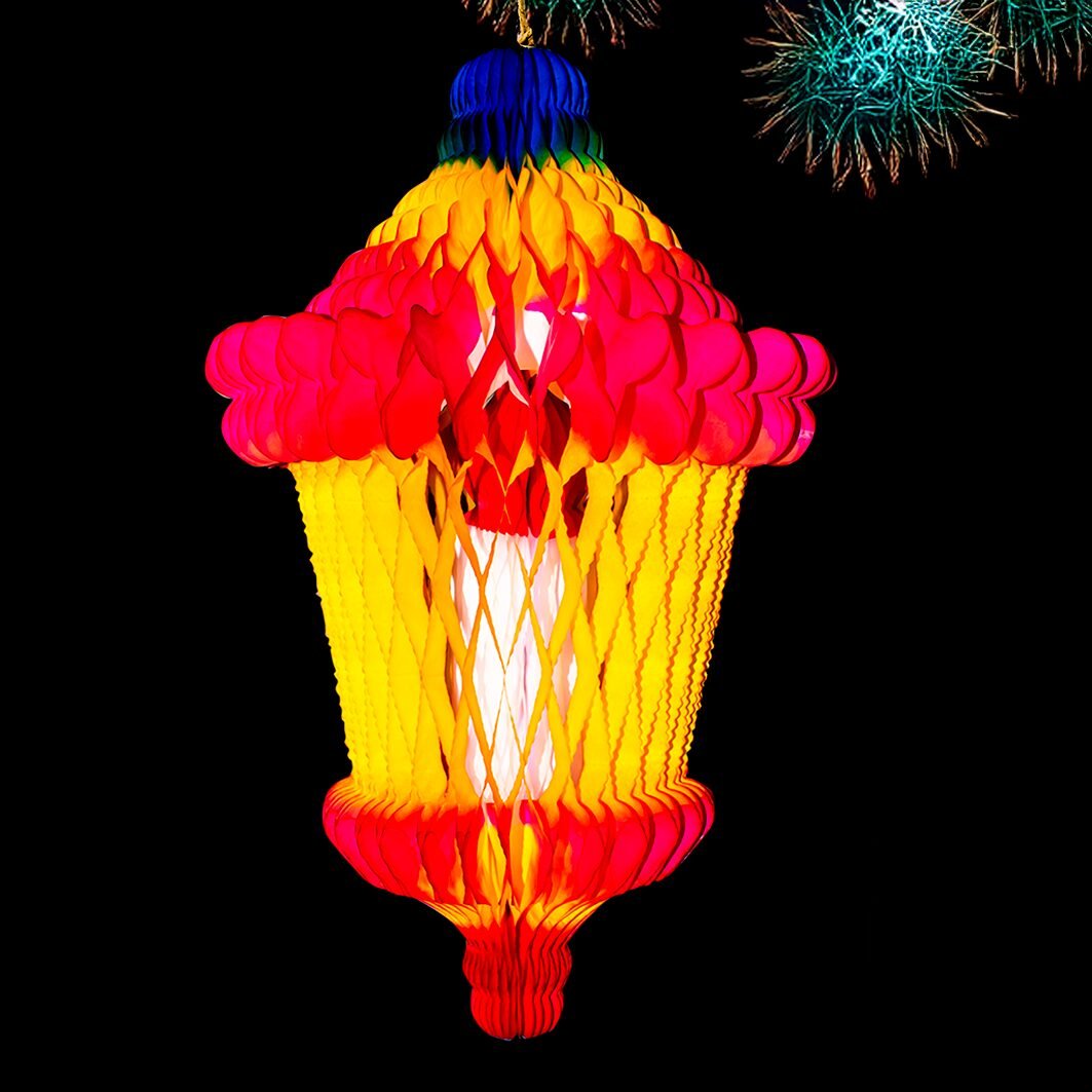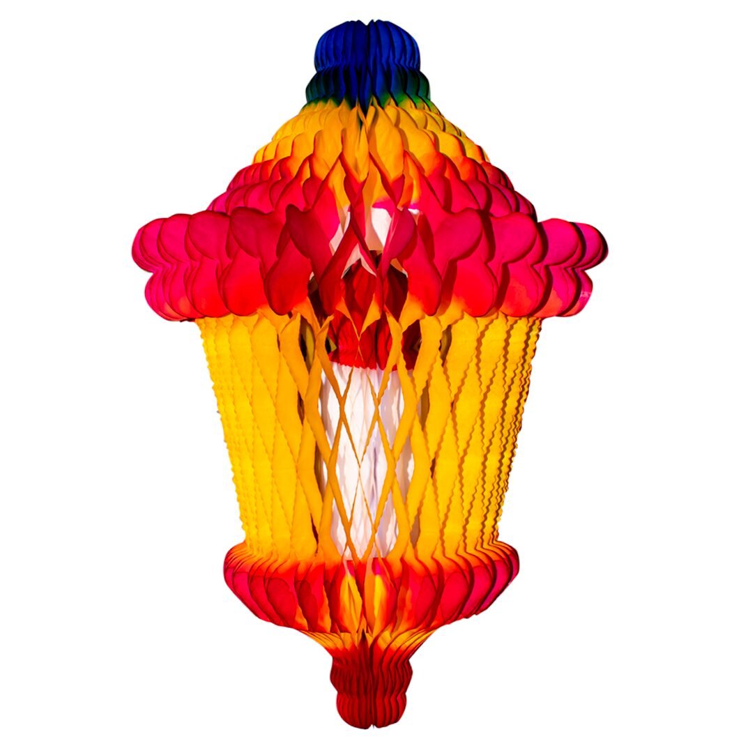 Farol decorativo multicolor N.3 con diseño tipo vela, perfecto para colgar en posadas, fiestas navideñas y celebraciones tradicionales.