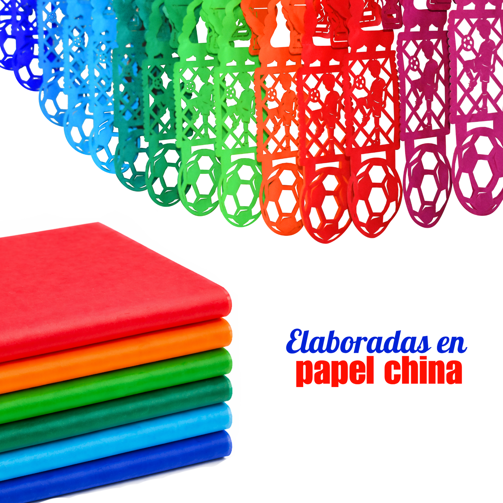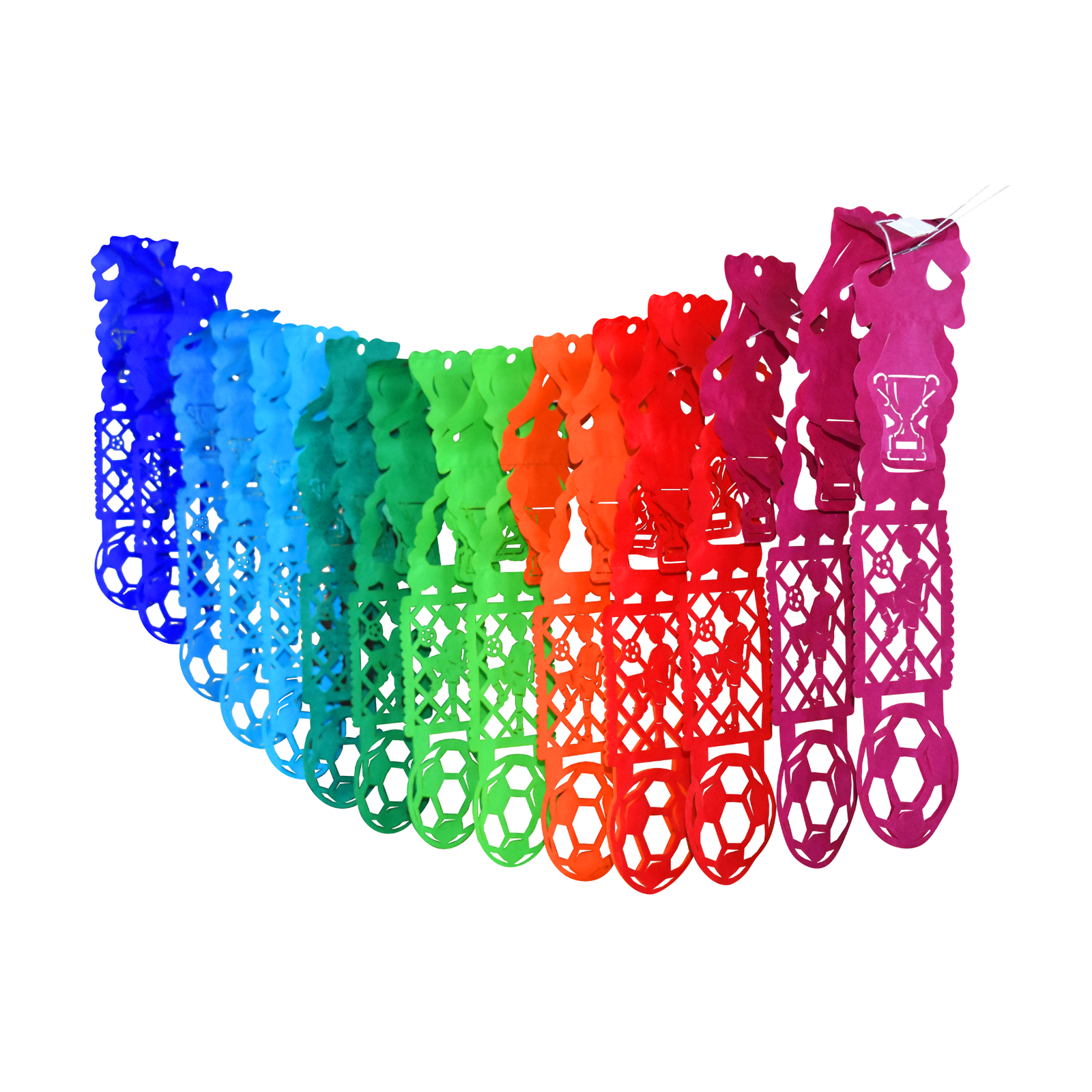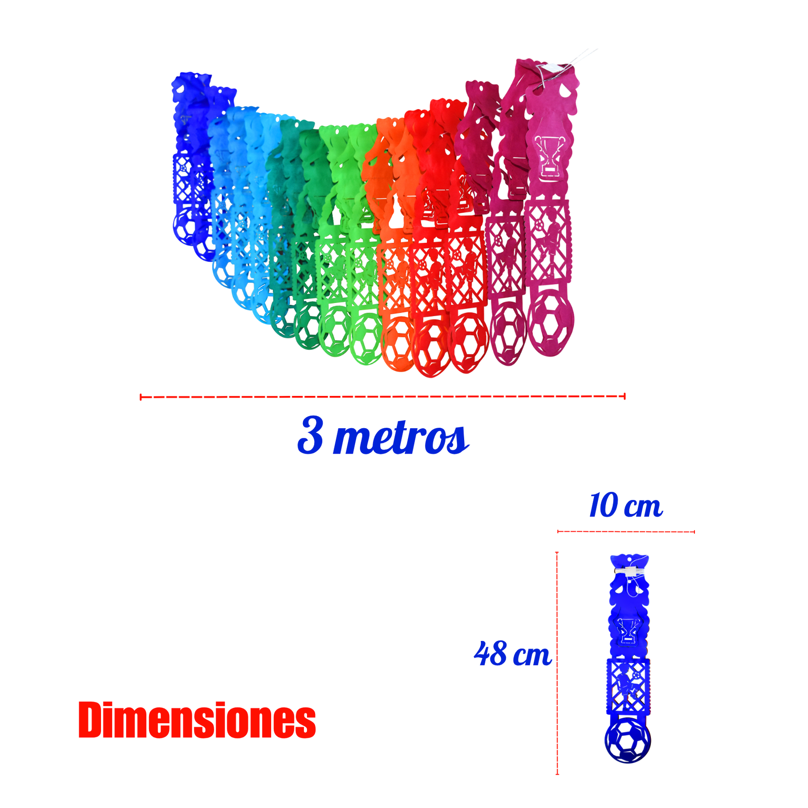 Festón de fútbol con diseño de jugador y balón en colores vibrantes. Ideal para decorar y vivir la pasión del juego. ¡Compra ahora y arma tu celebración!