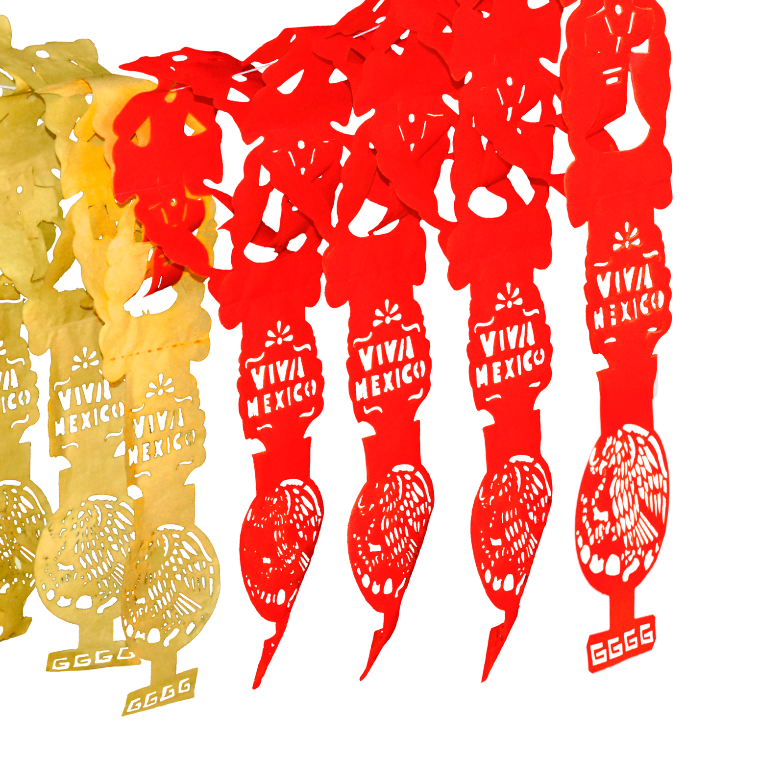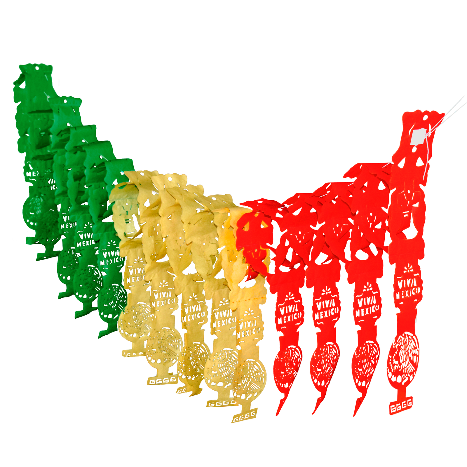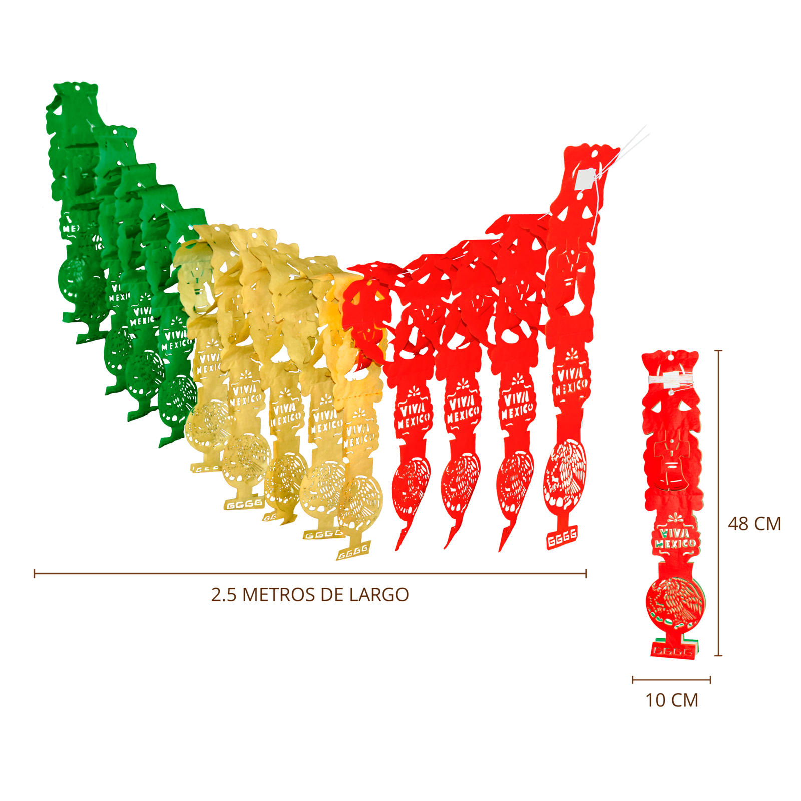 Decora tus celebraciones con este festón montable con figura de chile tricolor, elaborado en papel china con finos detalles artesanales. Su diseño combina los colores patrios en una forma tradicional y festiva, ideal para ambientar paredes, entradas o techos. Incluye cuerda instalada para un armado fácil y práctico, lo que lo convierte en una opción perfecta para dar un toque alegre y muy mexicano a tus espacios.