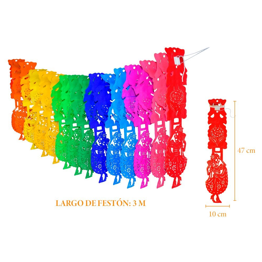 Festón montable elaborado en papel china con diseño de catrina bailarina en combinación multicolor. Su técnica en nido de abeja aporta volumen y movimiento, convirtiéndolo en el complemento perfecto para decorar espacios festivos con un toque tradicional y lleno de vida.