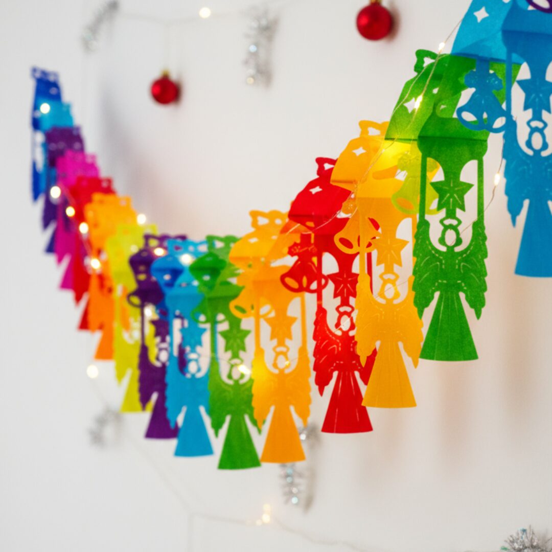 Festón desmontable de angelitos en papel china multicolor, práctico, ligero y fácil de ajustar a cualquier espacio.