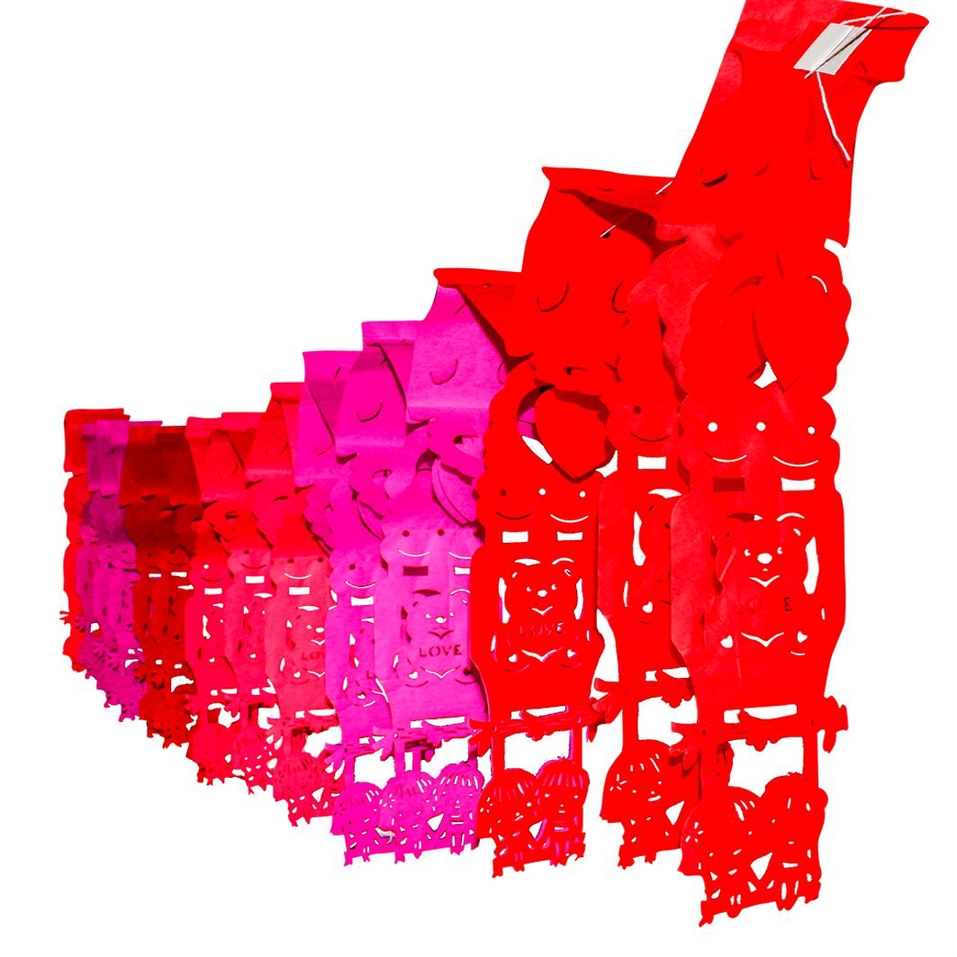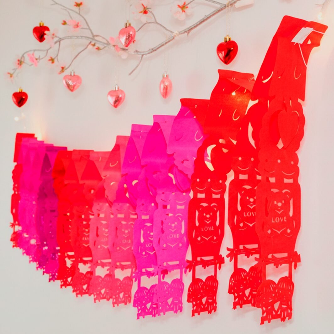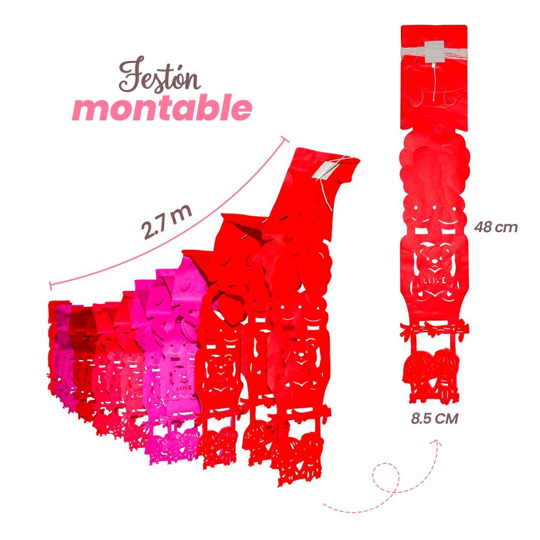Este festón es perfecto para ambientar celebraciones de San Valentín, aniversarios o eventos románticos. Su diseño calado y la combinación de colores aportan dinamismo y armonía, convirtiéndolo en un elemento protagonista que llena el espacio de significado y calidez.
