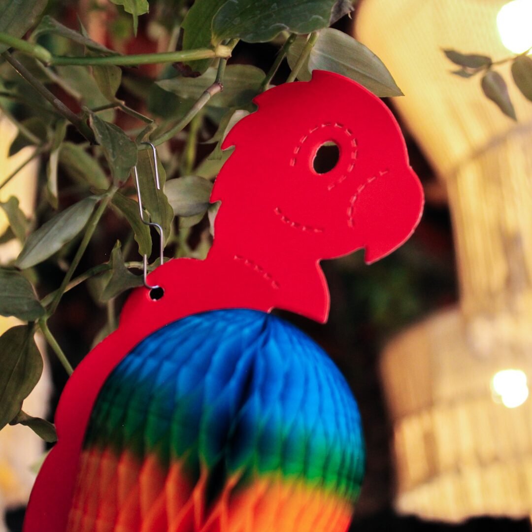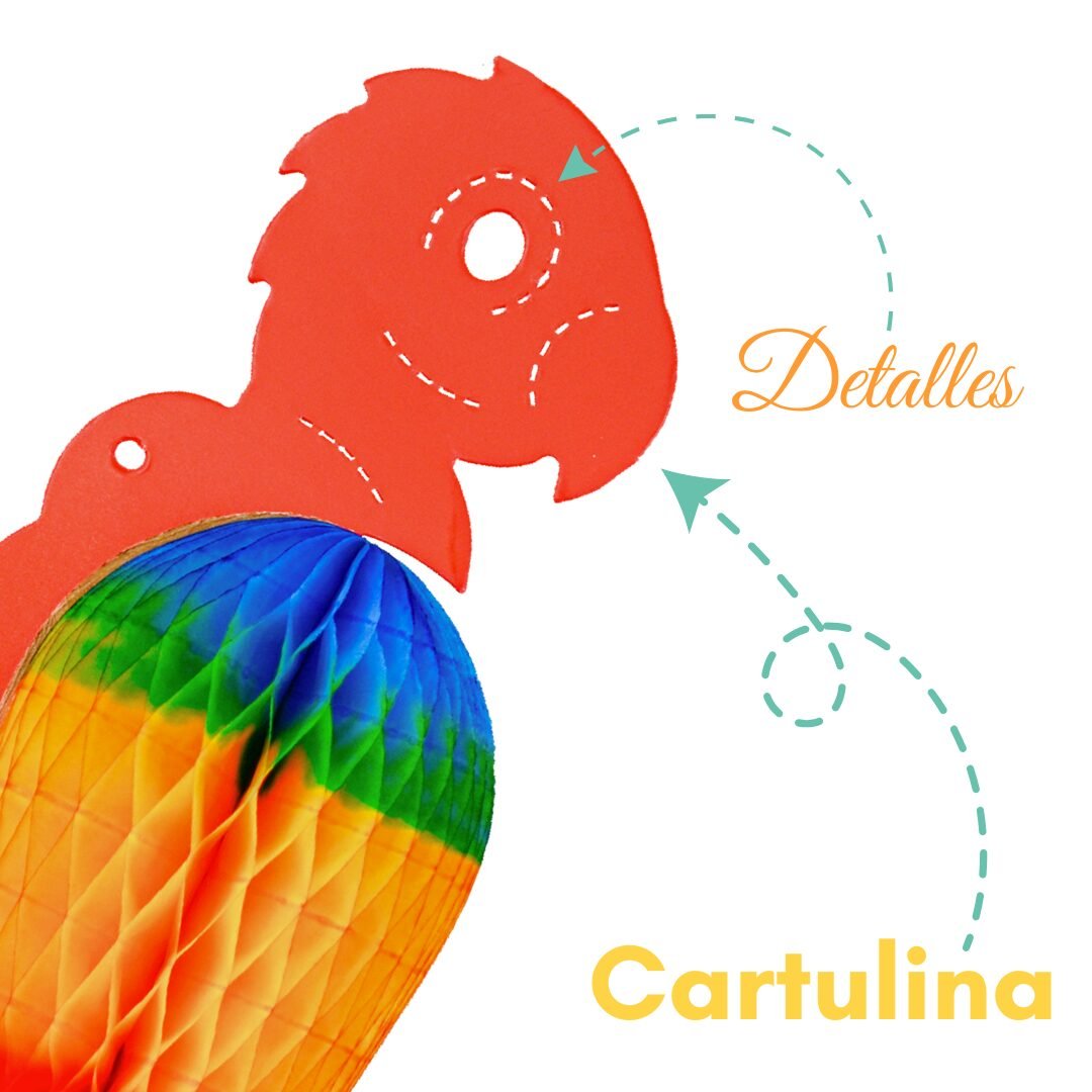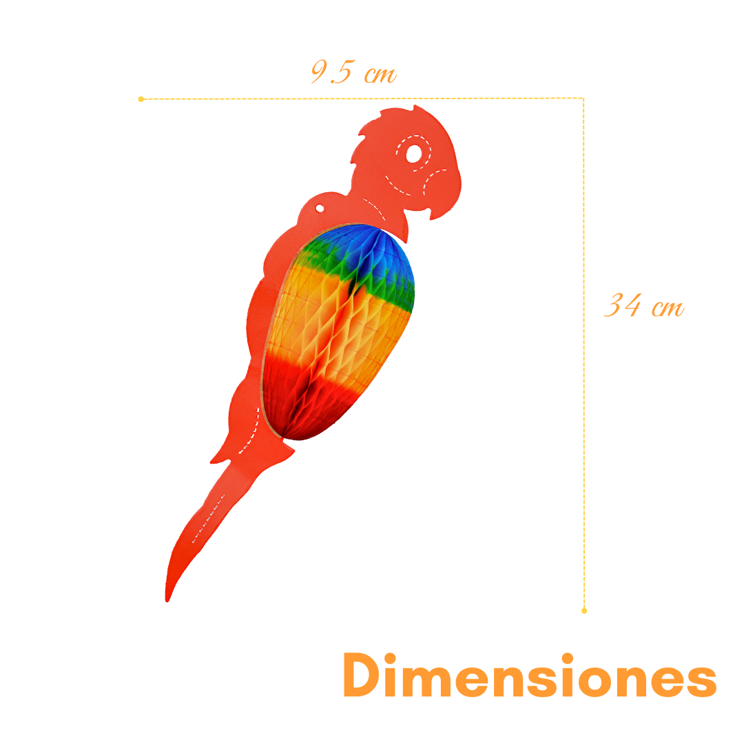 La guacamaya artesanal es una figura decorativa colgante elaborada con gran detalle y acabado hecho a mano. La parte superior está fabricada en cartulina mate, mientras que la pancita está realizada en papel china con técnica tipo nido de abeja, pintada a mano en una vibrante gama multicolor que resalta su diseño.