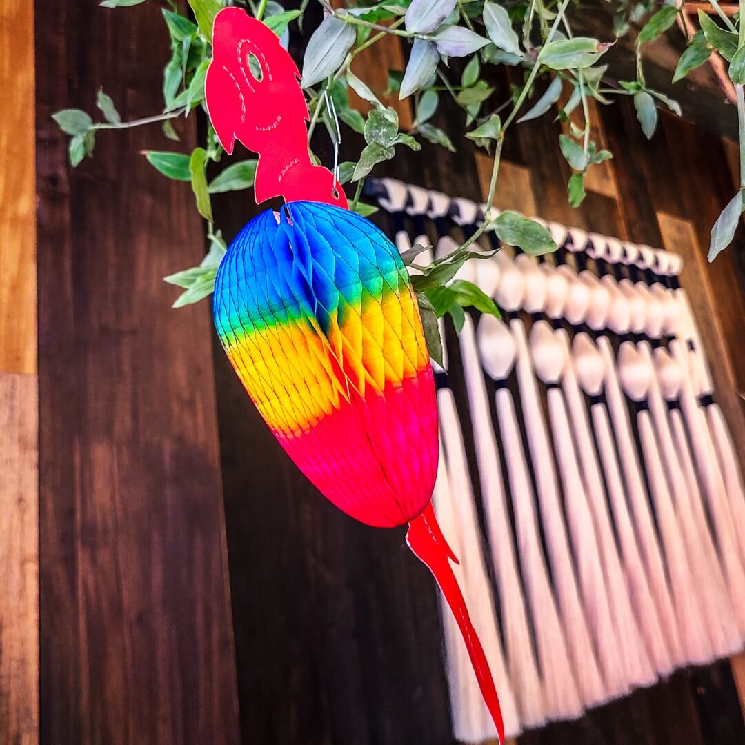 Esta guacamaya artesanal es ideal para ambientaciones temáticas, fiestas tropicales, decoraciones coloridas o espacios que busquen un toque artesanal y original. Producto disponible hasta agotar existencias.