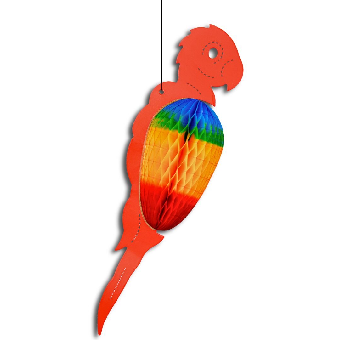 Guacamaya artesanal colgante con detalles calados y pancita en papel china tipo nido de abeja pintada a mano. Plegable, ligera y decorativa.