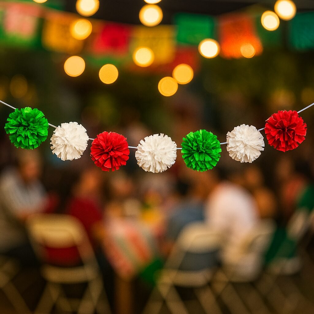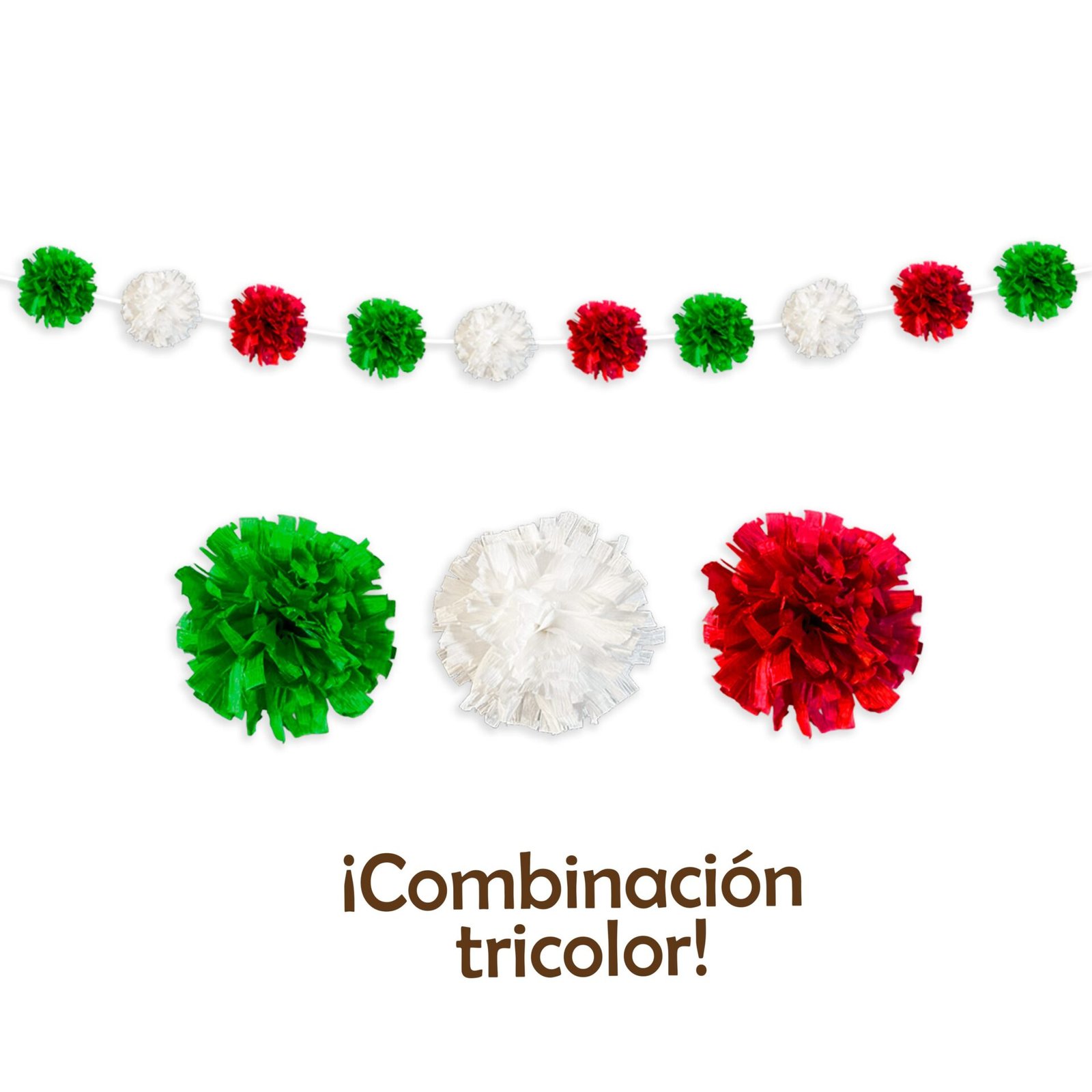 Guirnalda con 10 pompones de papel crepé en colores patrios. ¡Ideal para dar color y alegría a tus fiestas mexicanas!