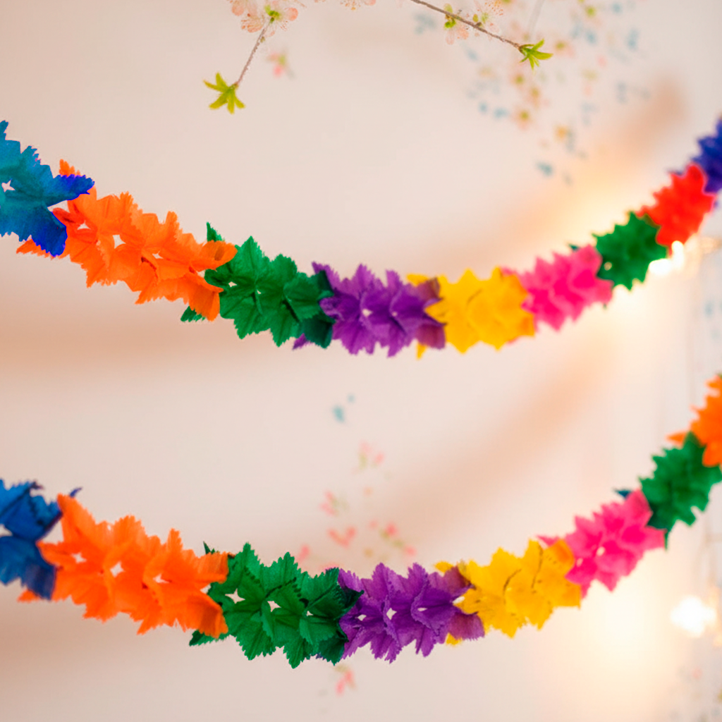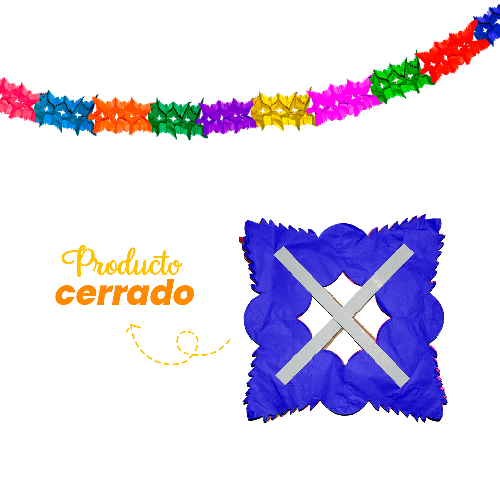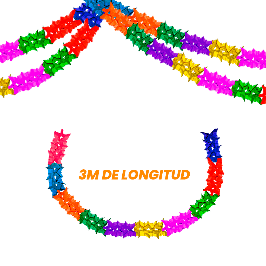 Fabricado en papel multicolor, ofrece un efecto vibrante que resalta en interiores y áreas protegidas. Gracias a su formato ligero y fácil armado, es una opción práctica para decorar salones, techos, mesas principales o montajes decorativos de temporada.