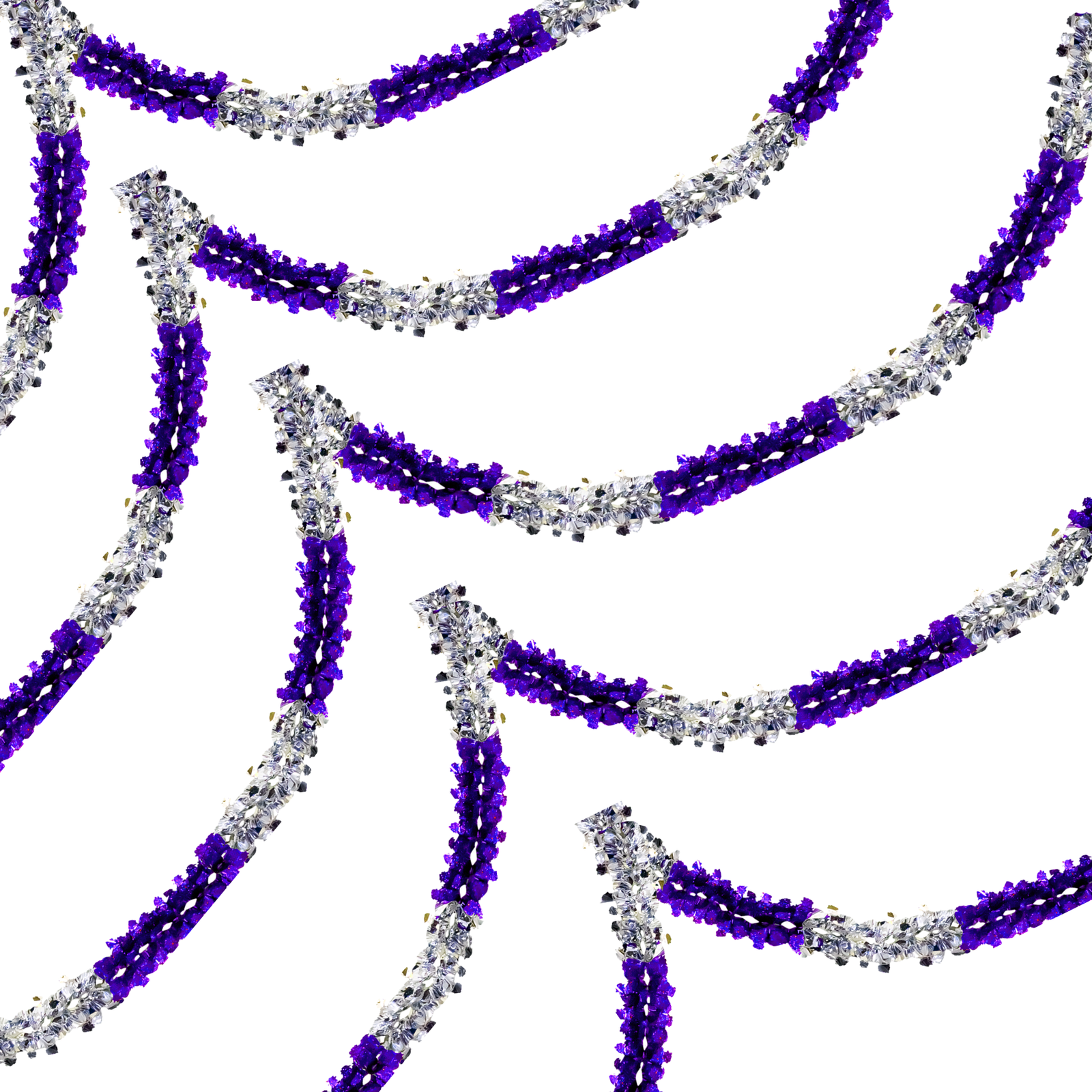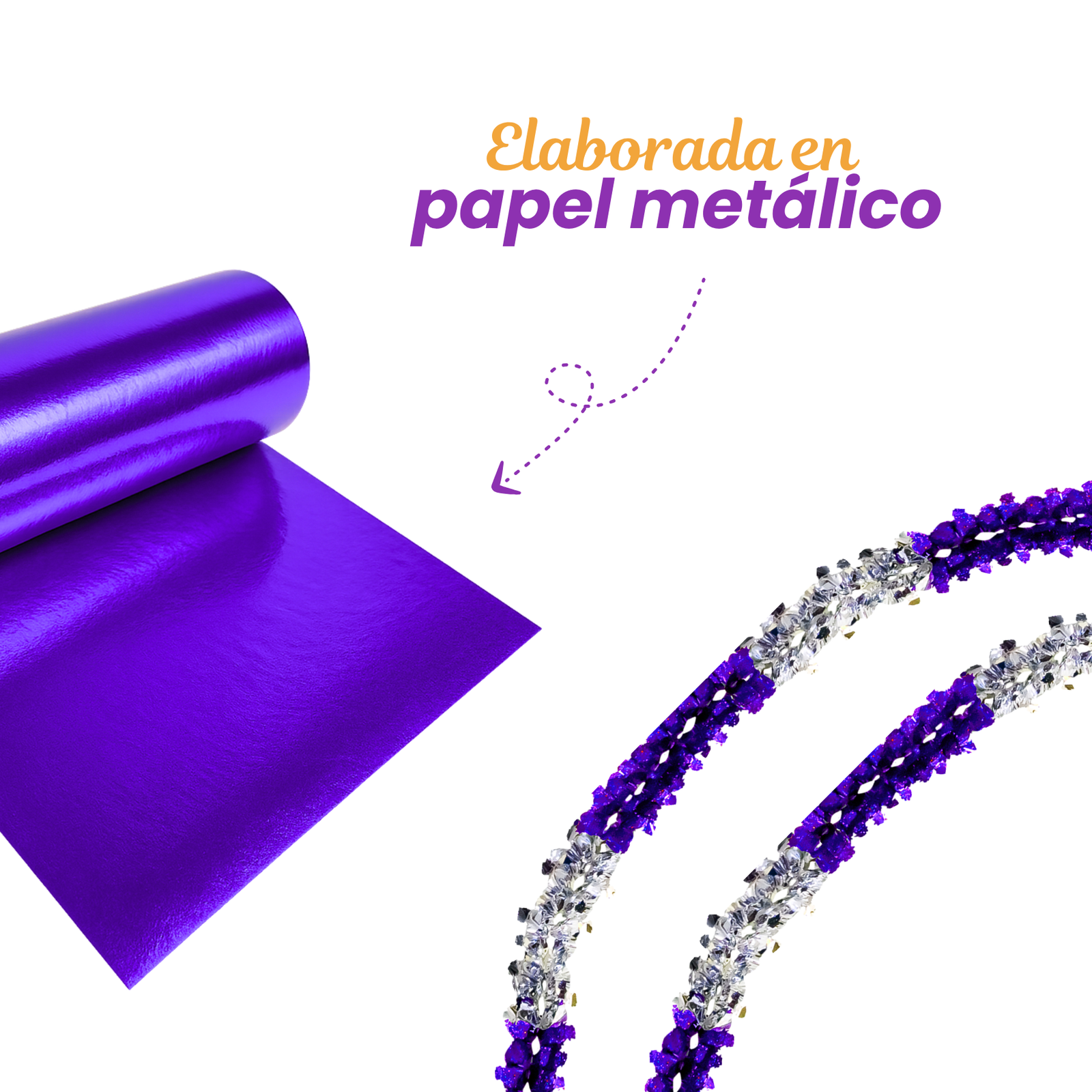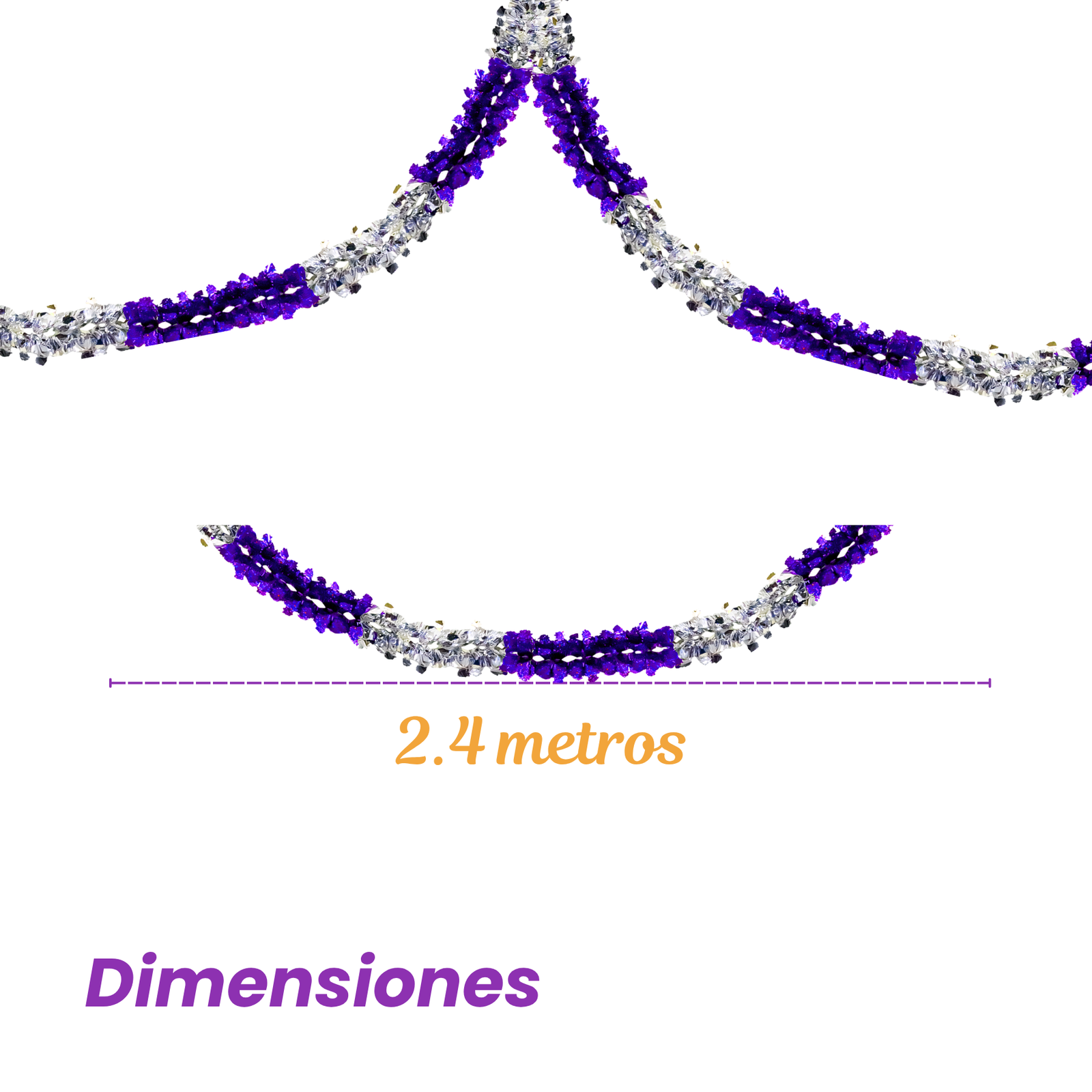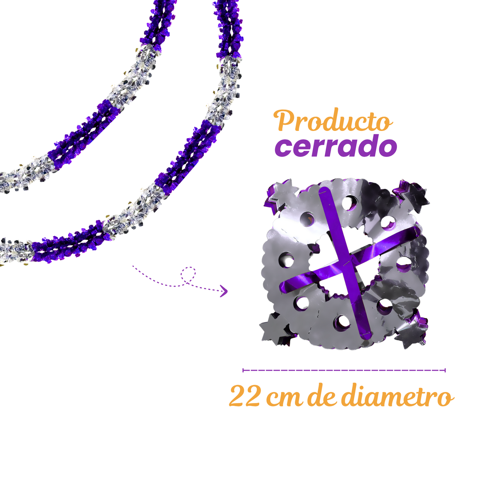 Elaborado en papel metálico, su diseño tipo gusano crea una forma flexible con acabado brillante que aporta movimiento visual a muros, techos, pasillos o fondos decorativos. La combinación de colores plata y morado permite integrarlo fácilmente con otros elementos decorativos de temporada. Es una opción funcional para decoraciones que buscan incorporar elementos metálicos con volumen y contraste visual.