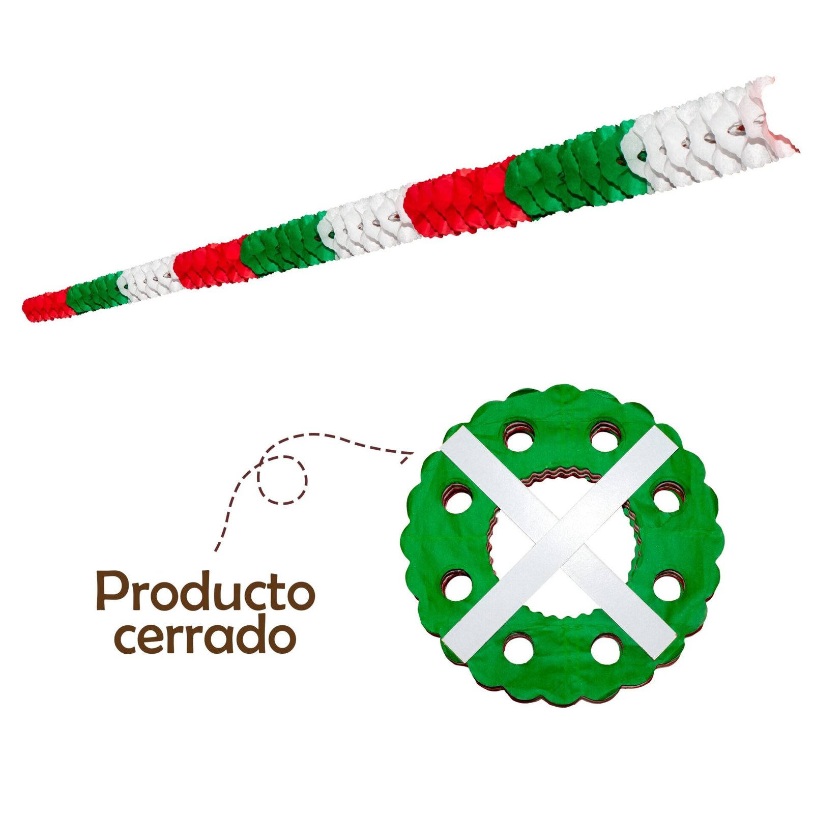 Gusano de papel No. 2 elaborado de forma artesanal con papel china en una alegre combinación de colores patrios: verde, blanco y rojo. Su forma aporta movimiento y volumen, siendo perfecto para colgar en techos, marcos, pasillos o paredes. Ligero, llamativo y fácil de colocar, es una opción tradicional que llena de color y alegría cualquier celebración mexicana.
