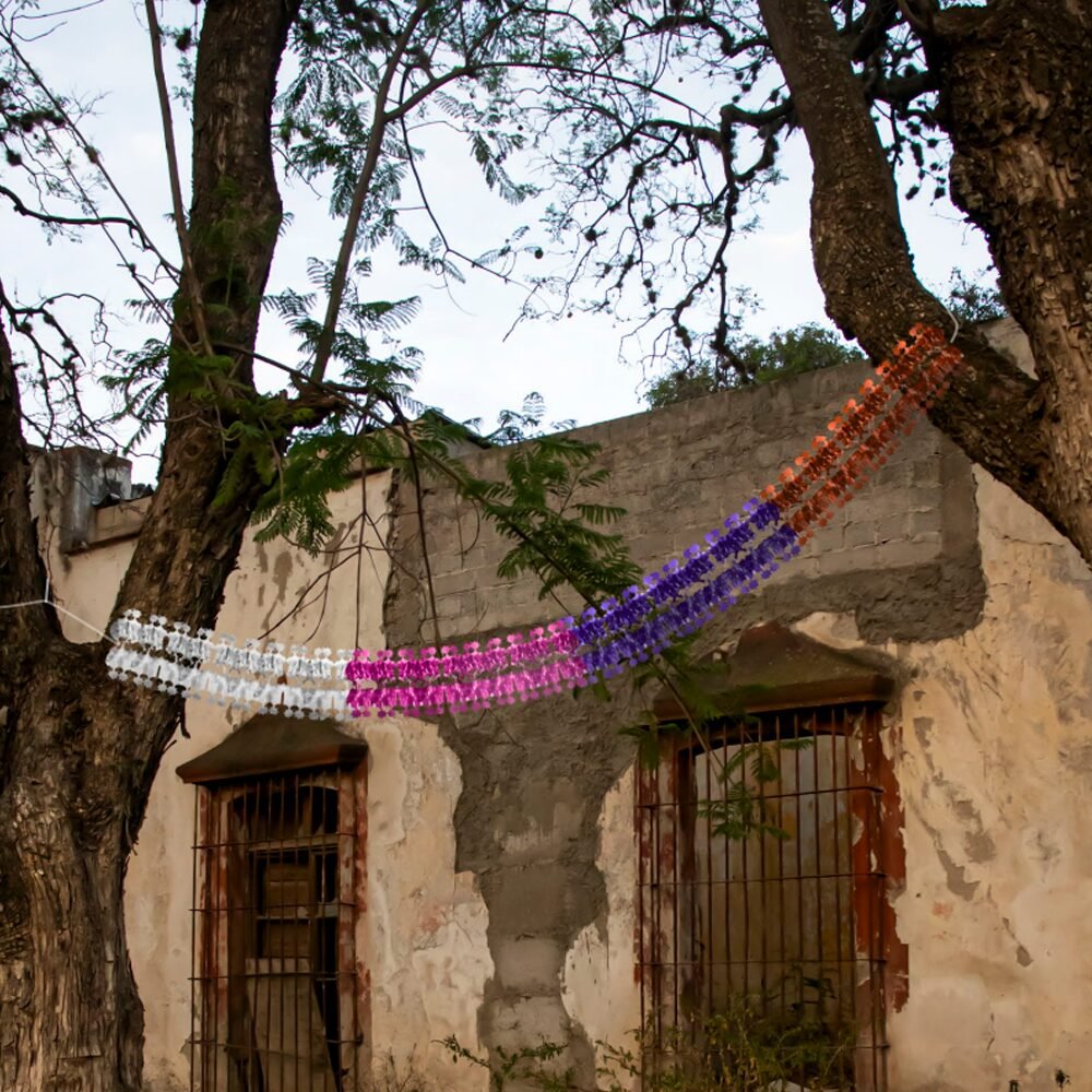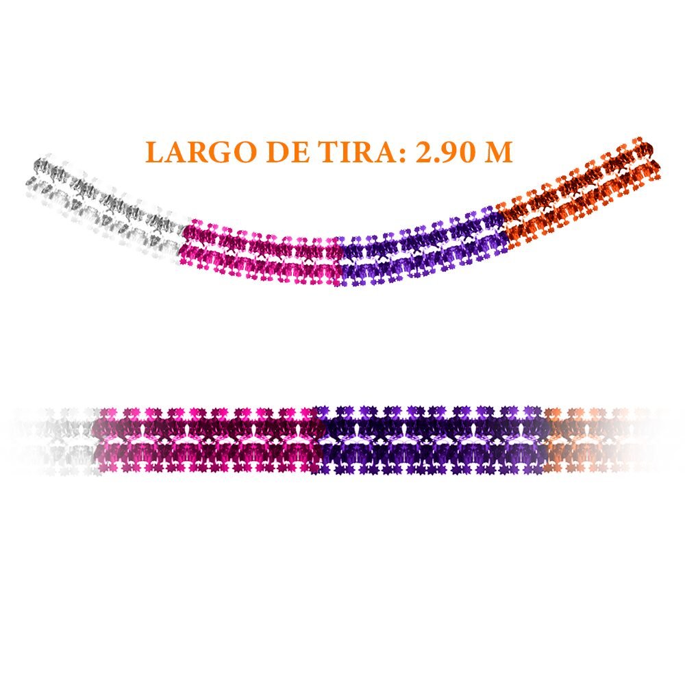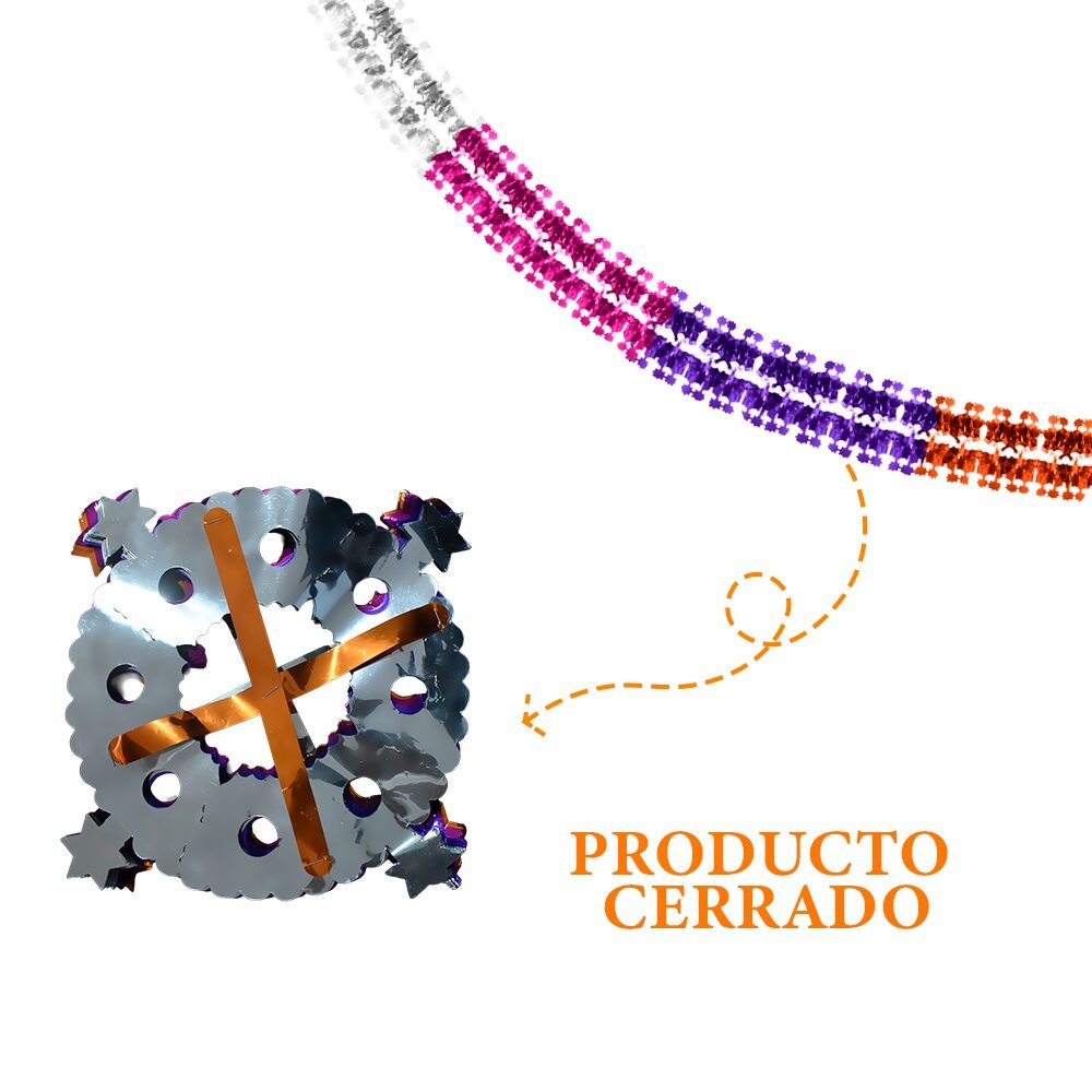 Tira de gusano montable elaborada en papel metálico, en una combinación de colores tradicionales del Día de Muertos. Su diseño articulado aporta movimiento, brillo y un estilo festivo que realza cualquier altar o espacio decorativo durante esta celebración.