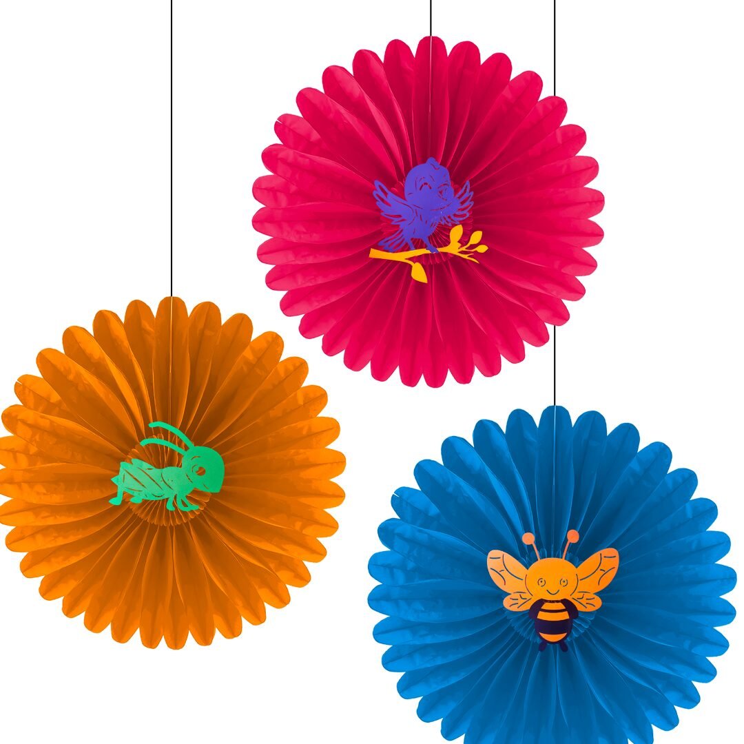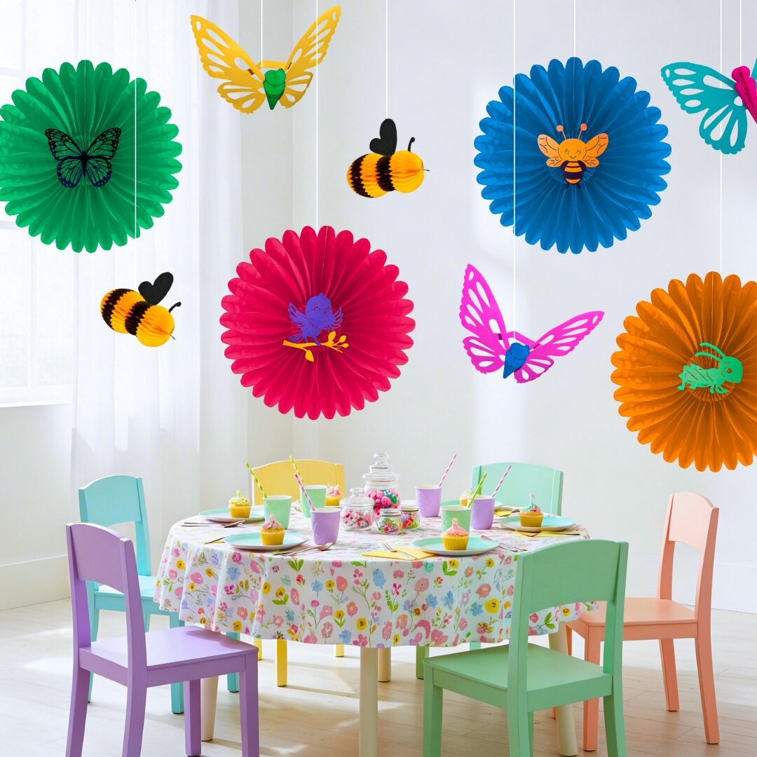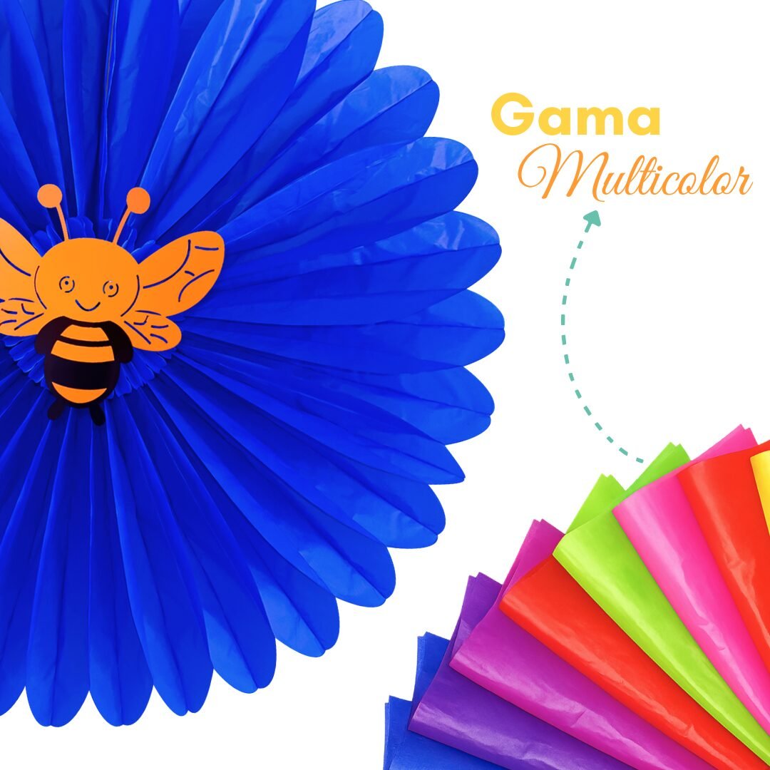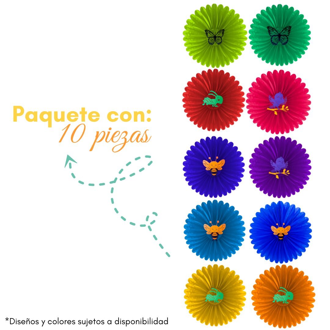 Cada flor está elaborada en papel china, lo que la hace ligera y fácil de manipular. En el centro incorpora una figura de cartulina con temática primaveral, disponible en 4 diseños diferentes (colores y modelos sujetos a disponibilidad), aportando variedad y un toque especial a la decoración.