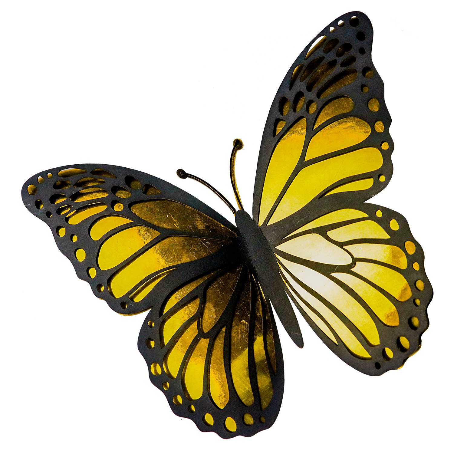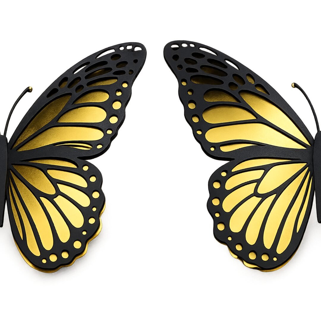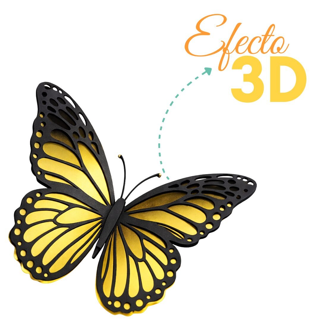 Añade un toque elegante y brillante a tus decoraciones con estas mariposas inspiradas en la mariposa monarca. Cada pieza está elaborada en cartulina metálica dorada, con una capa superior en cartulina negra calada que resalta los detalles del diseño y da un efecto tridimensional muy llamativo.