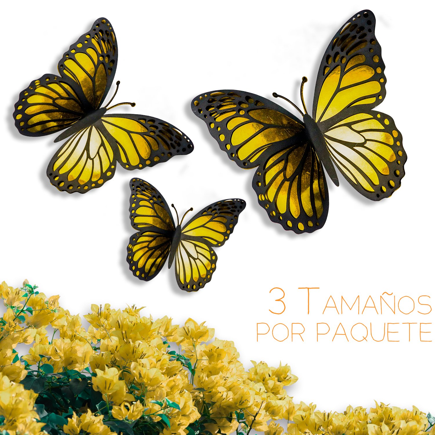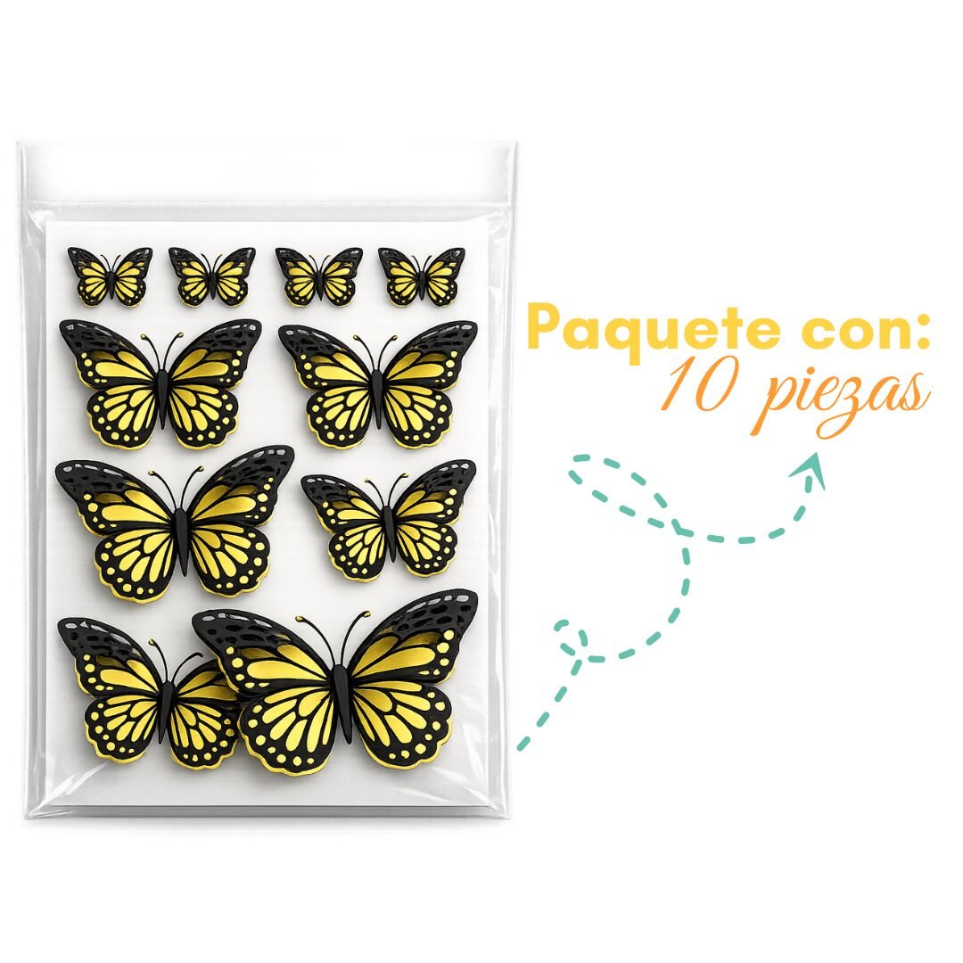 Incluye 10 mariposas en 3 tamaños distintos: 4 piezas tamaño #1, 3 piezas tamaño #2, 3 piezas tamaño #3 .