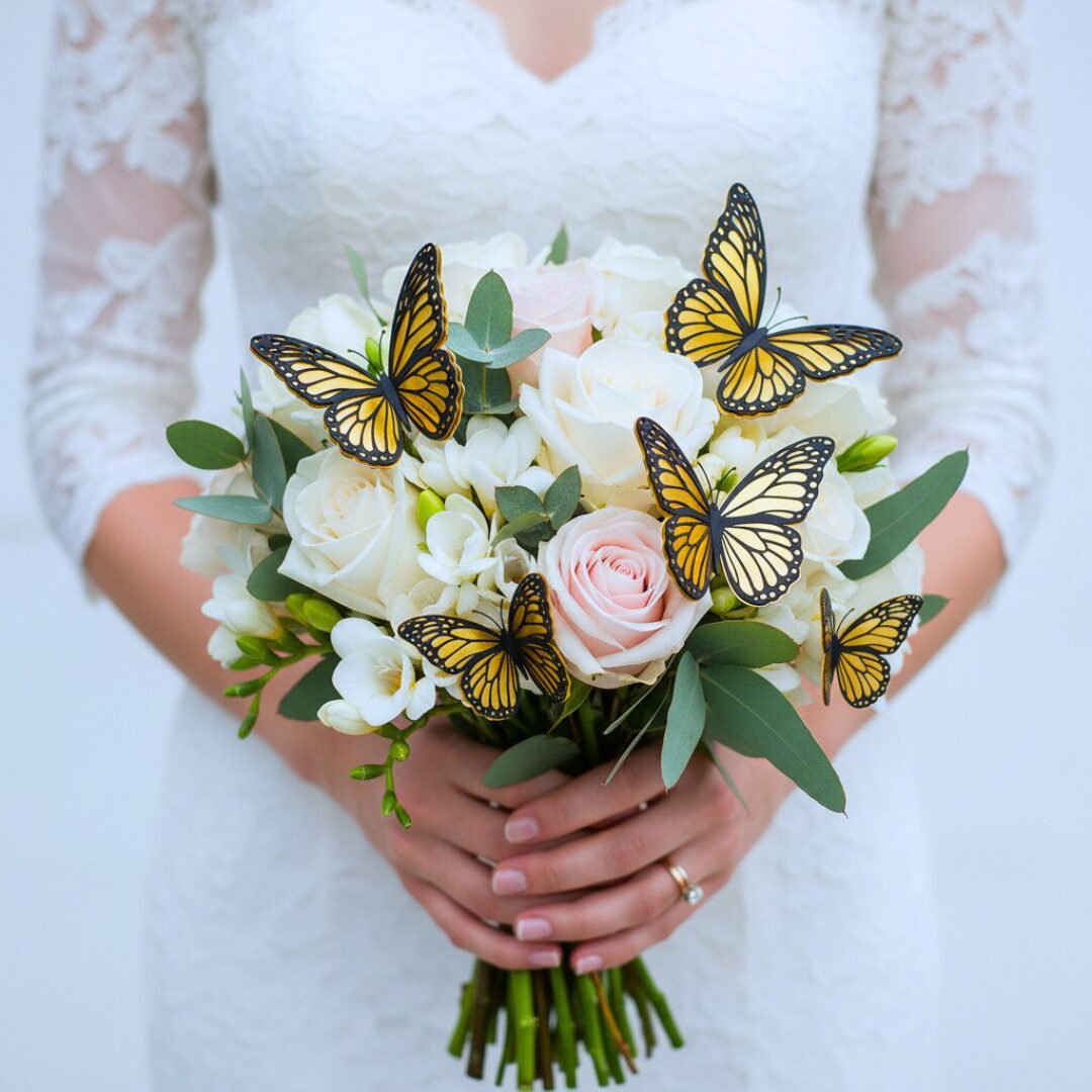 Kit de 10 mariposas monarca decorativas en cartulina dorada metálica con detalle calado en negro. Tres tamaños. Ideal para pared o centros de mesa.