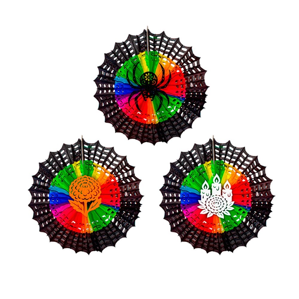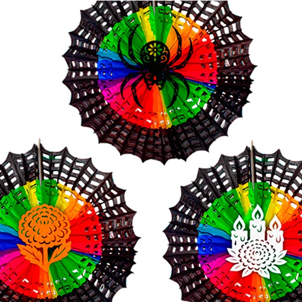 Kit de 10 figuras plegables en forma de telaraña, con tres diseños diferentes: araña, vela y flor de cempasúchil. Elaboradas con papel china en técnica nido de abeja, estas piezas son ideales para darle un estilo original, colorido y festivo a tu altar o decoración de Día de Muertos.