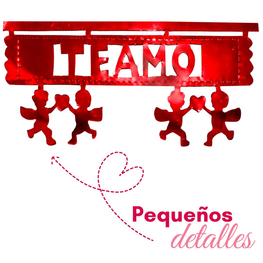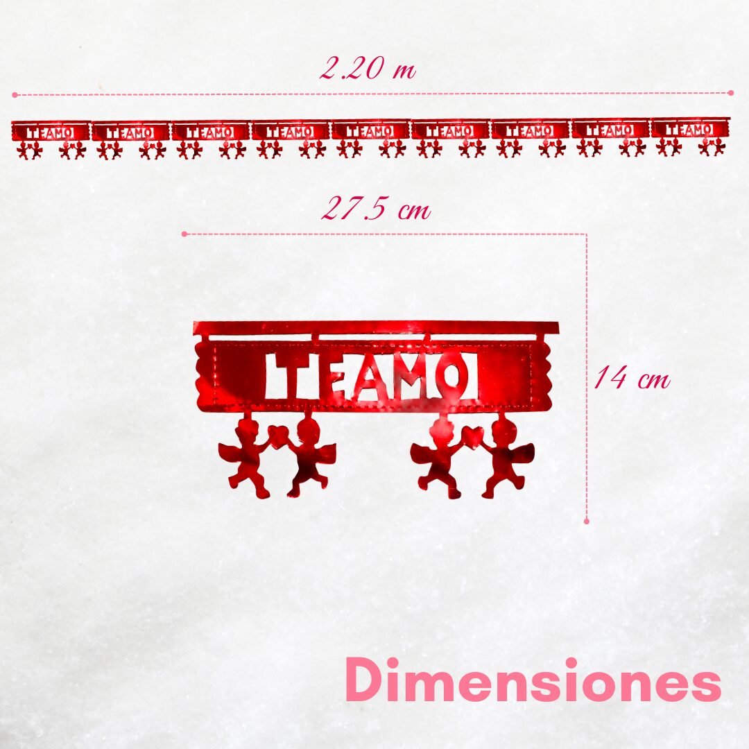 Esta tira decorativa de papel metálico es una opción ligera y llamativa para ambientar espacios especiales. Cuenta con varias carpetas, y en cada una aparece la leyenda “Te amo”, acompañada de pequeños cupidos colgantes que aportan movimiento y un toque romántico.
