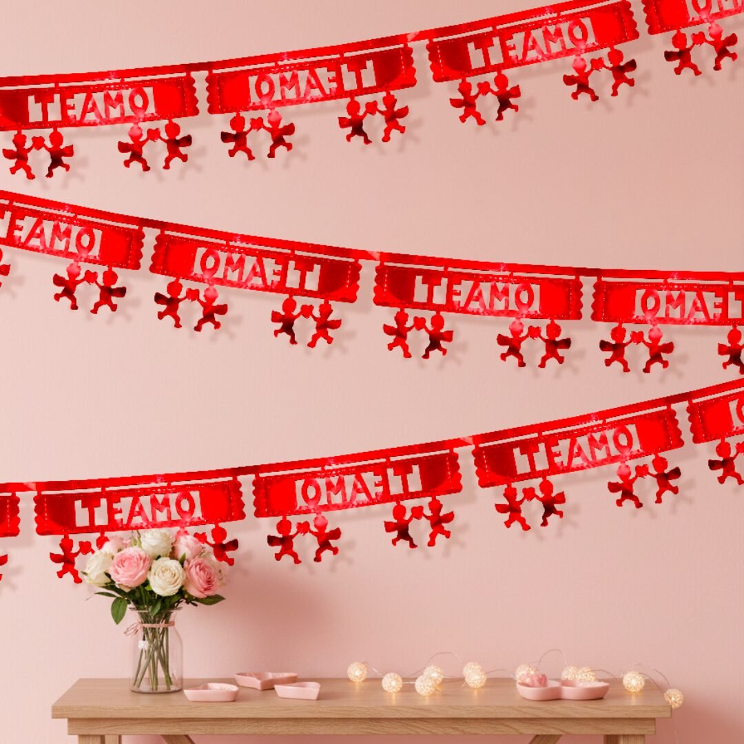 Tira decorativa ligera de papel metálico color rojo, con carpetas que dicen “Te amo” y pequeños cupidos colgantes. Diseño de doble vista.
