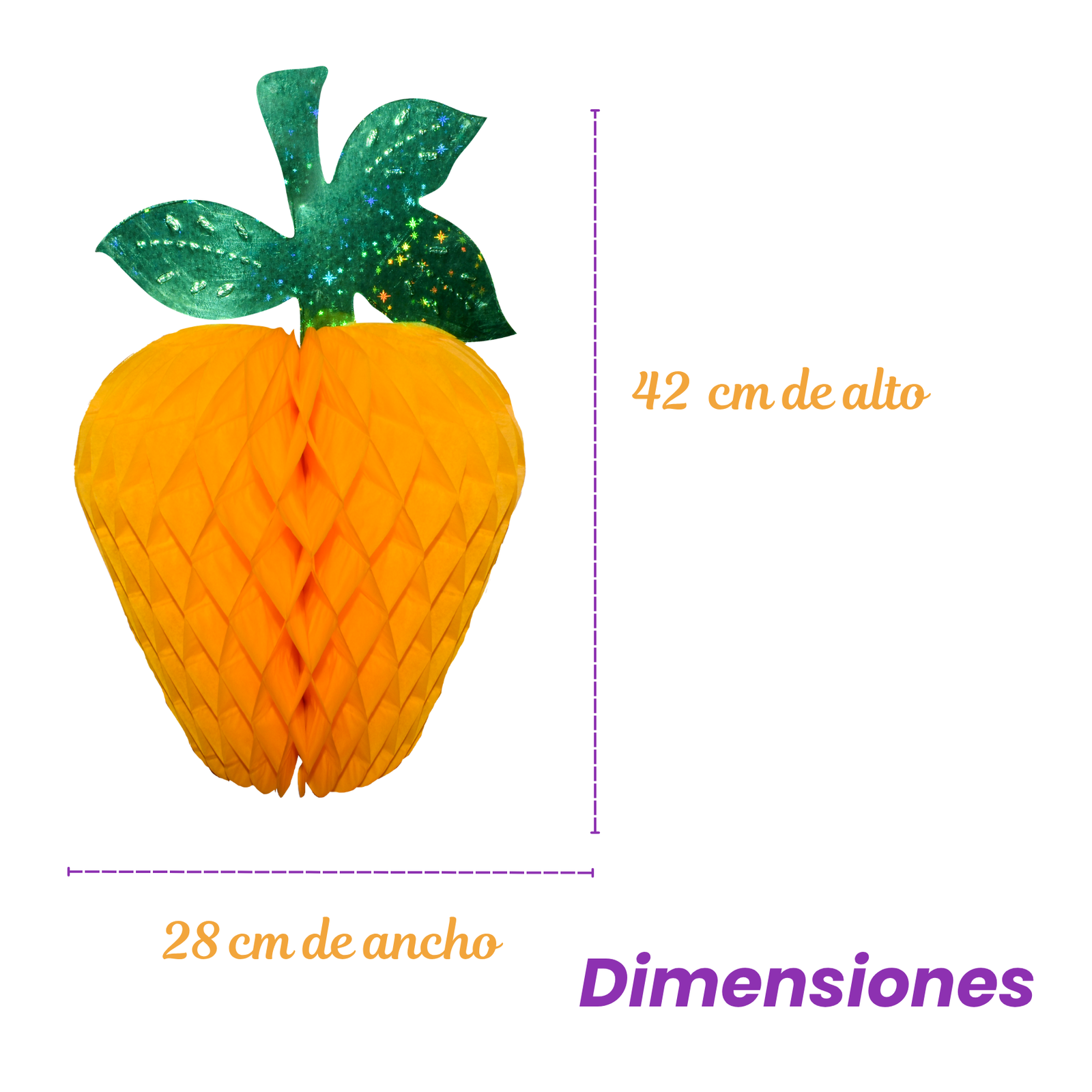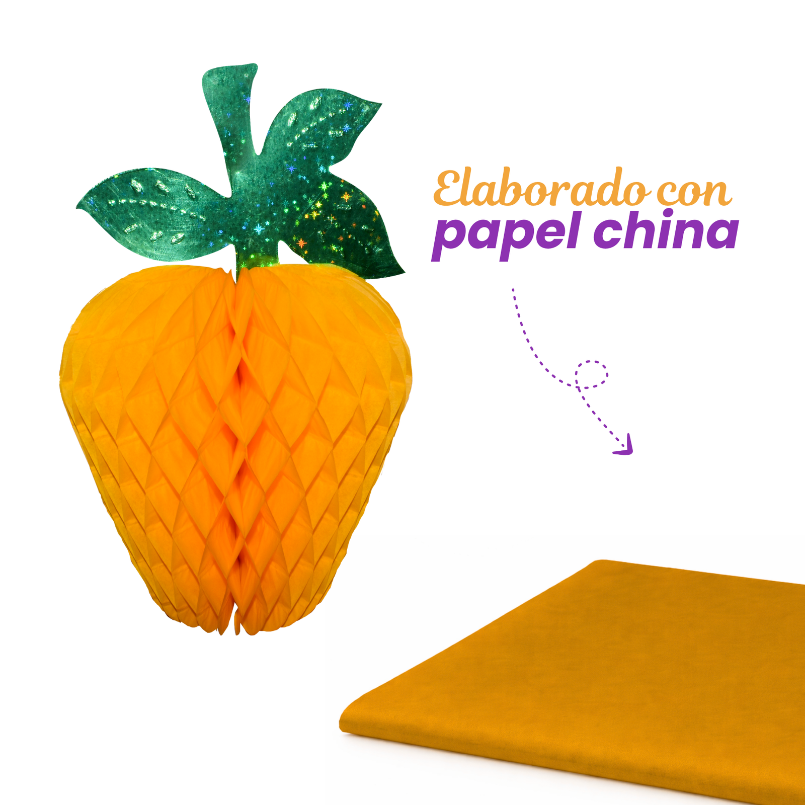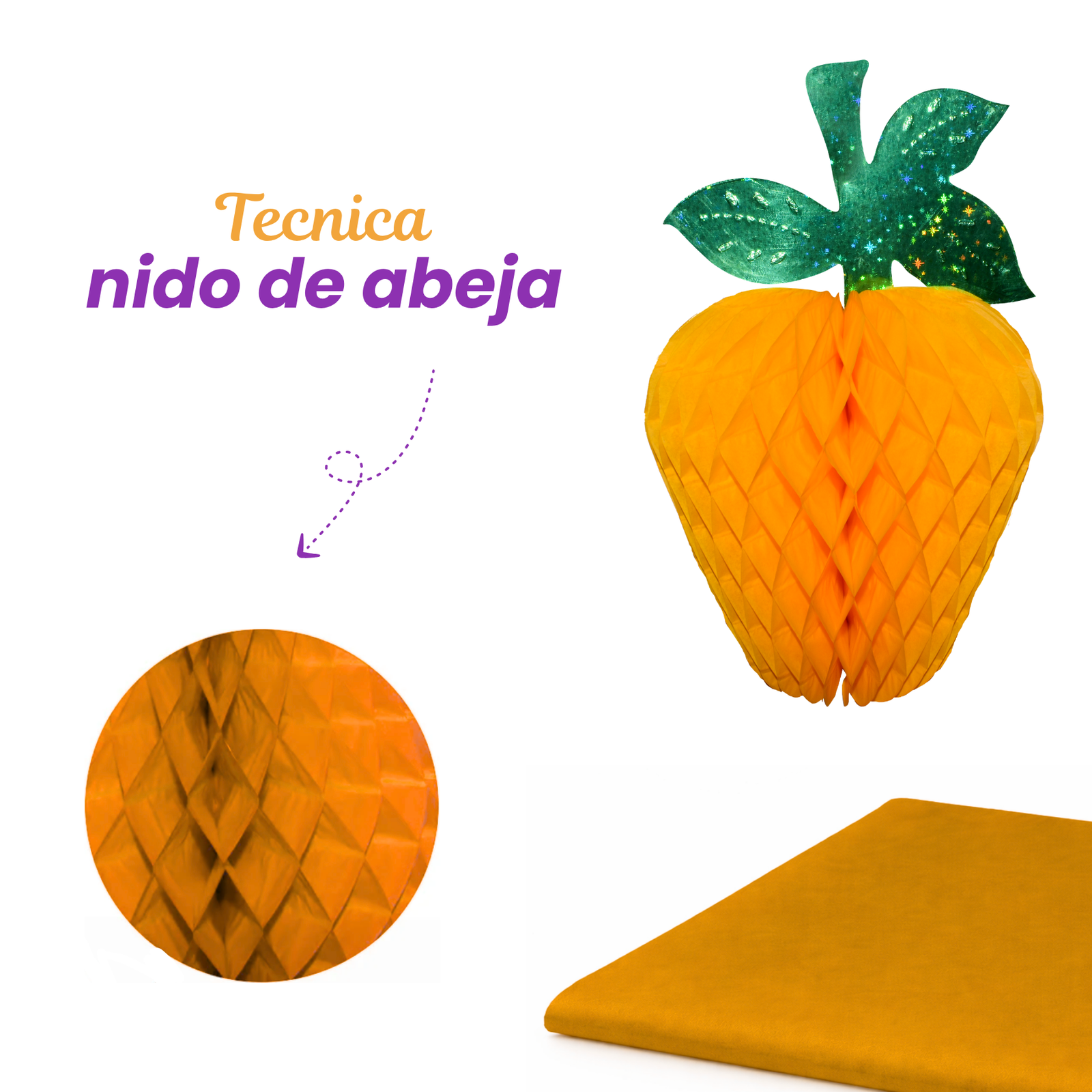 La Manzana Amarilla 3 es una figura decorativa plegable elaborada en papel china, diseñada para aportar volumen y color a ambientaciones temáticas. Fabricada con técnica tipo nido de abeja, su estructura tridimensional genera un efecto visual ligero que ayuda a destacar la decoración en distintos espacios. Su diseño en tono amarillo con hoja verde decorativa permite integrarla fácilmente en montajes frutales, eventos temáticos, fiestas escolares o decoraciones comerciales.