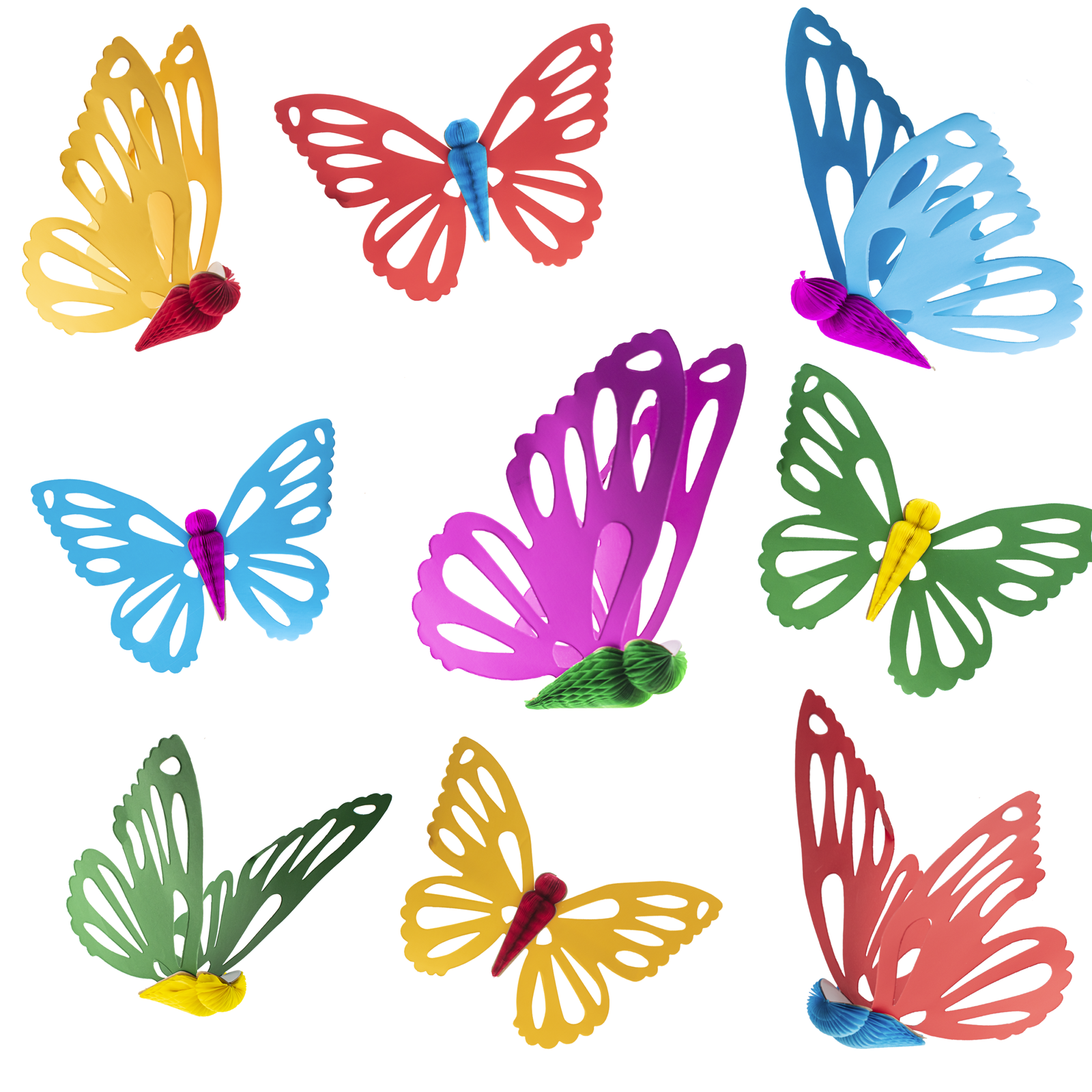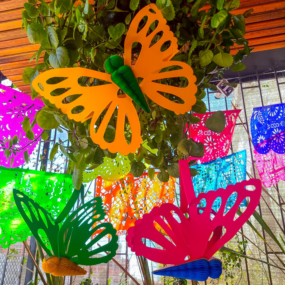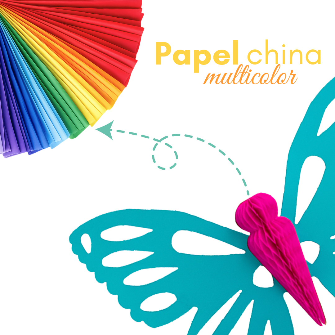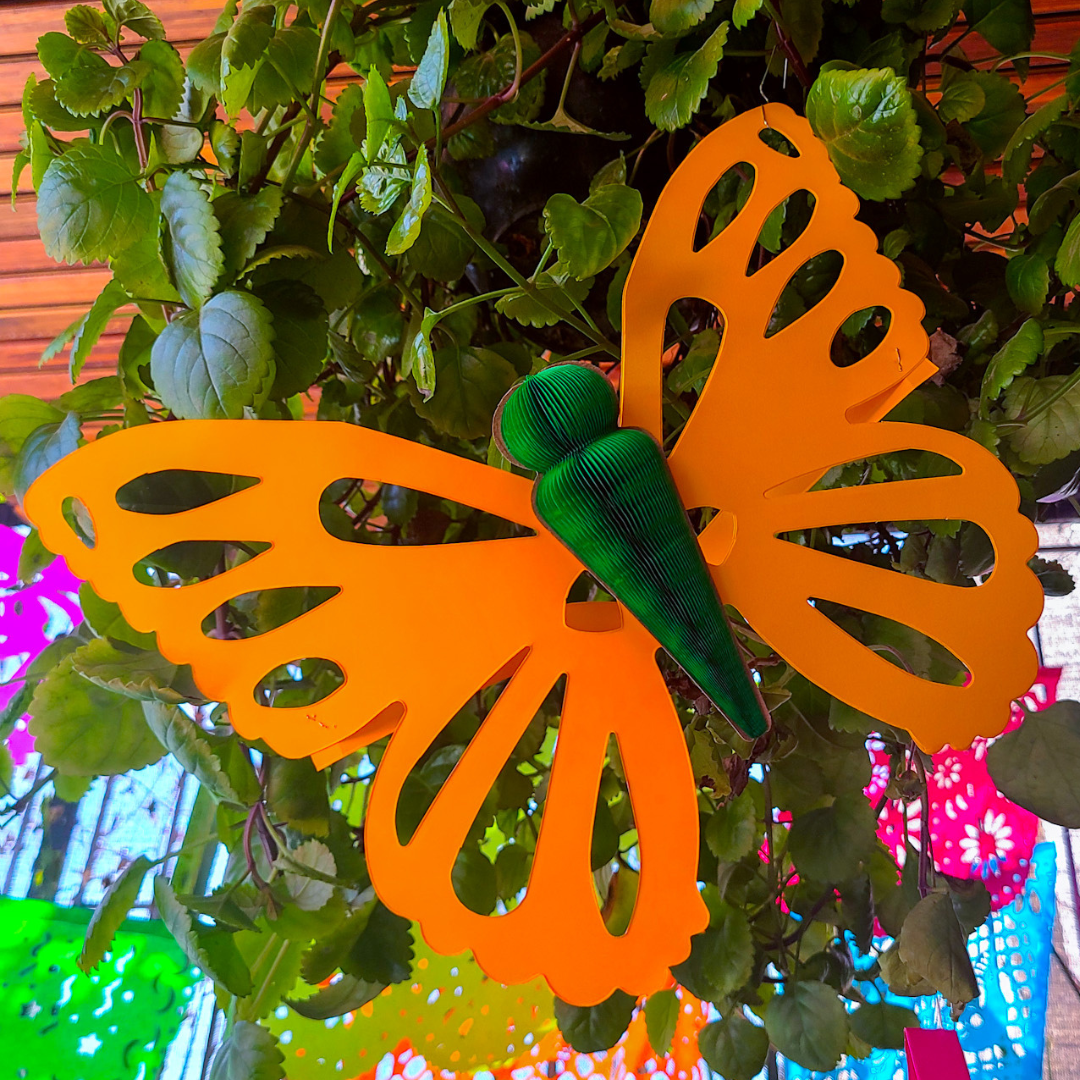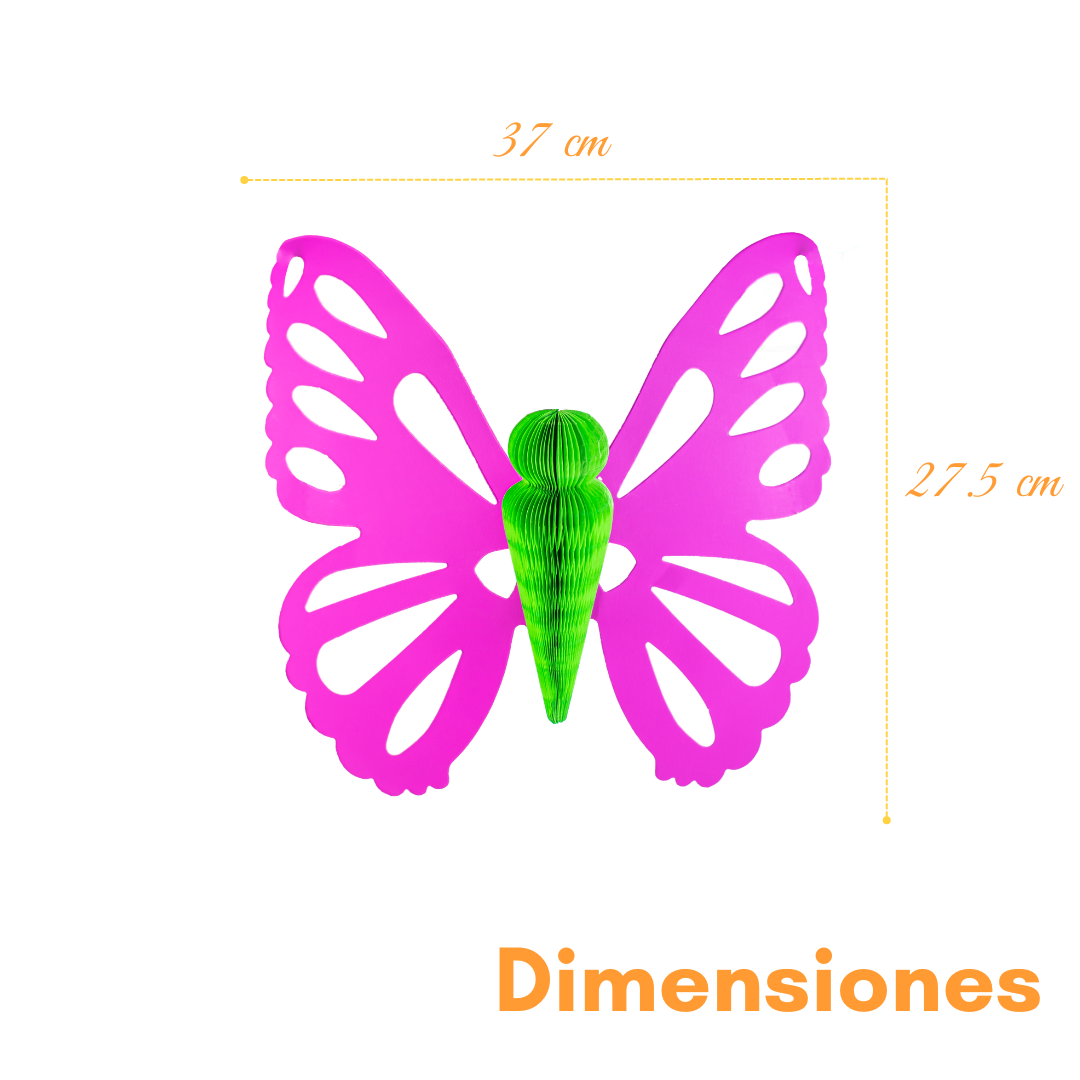 La mariposa artesanal colgante es una figura decorativa ligera y llamativa, ideal para ambientar espacios con un toque delicado y hecho a mano. Su cuerpo está elaborado en papel china con técnica tipo nido de abeja en un solo color, lo que aporta volumen y textura al diseño.