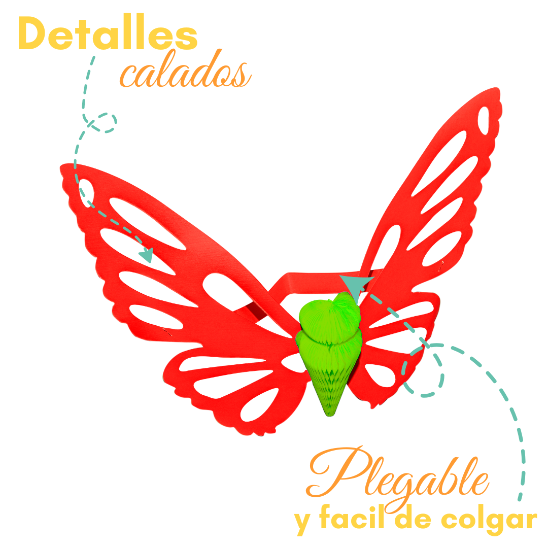 Las alas son grandes y están fabricadas en cartulina mate con detalles calados que realzan la forma de la mariposa y le dan mayor definición visual. Gracias a su estructura plegable, es fácil de guardar y transportar sin perder su forma.