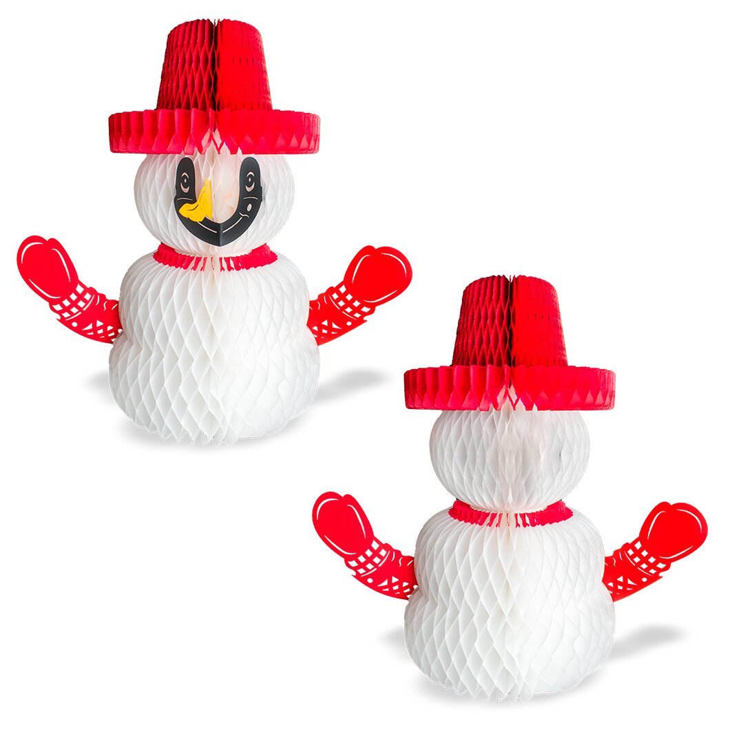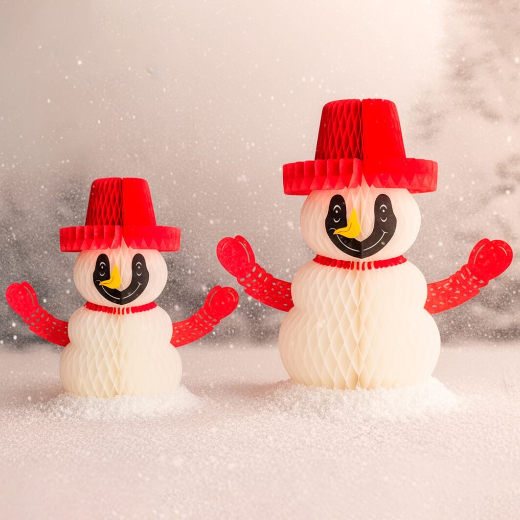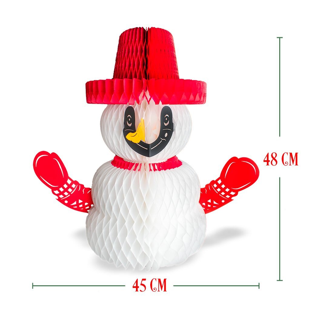 El Muñeco de Nieve 2 ofrece un diseño estilizado y ornamental, combinando el cuerpo de papel china con detalles recortados en cartulina metálica que le dan un brillo único. Su estructura plegable permite montarlo fácilmente y guardarlo sin ocupar espacio. Es perfecto para decorar mesas, repisas, áreas de bienvenida y eventos temáticos. Su estilo tradicional, expresivo y amigable aporta un toque acogedor y festivo a cualquier ambiente.