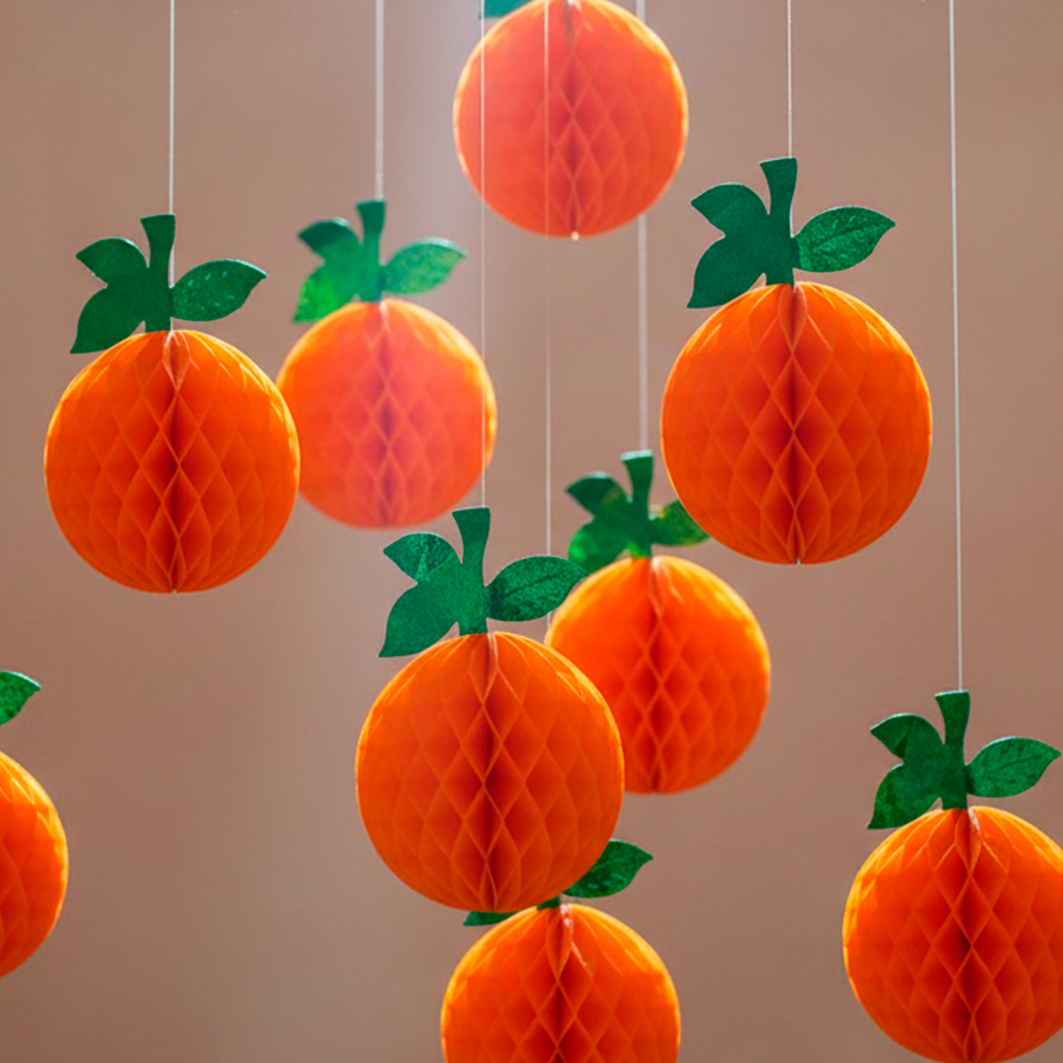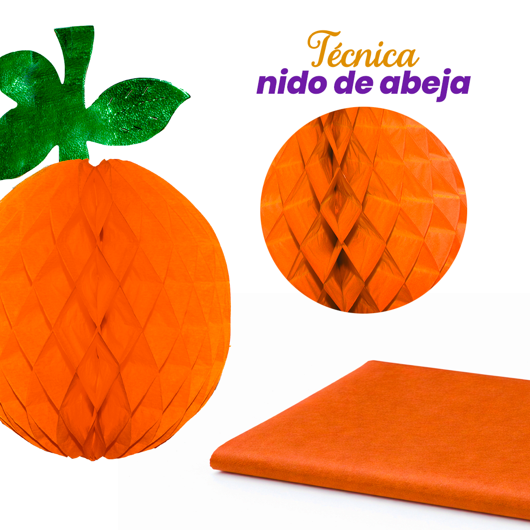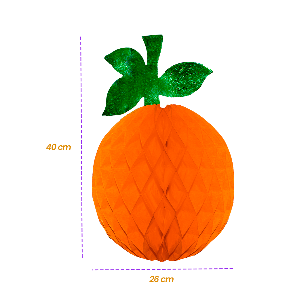 Naranja decorativa plegable de papel china, con efecto nido de abeja. Ideal para fiestas y ambientaciones temáticas. Inclúyela en tu pedido y complementa tu decoración.